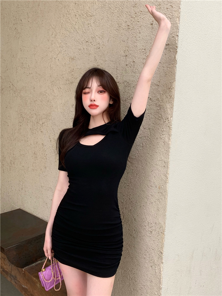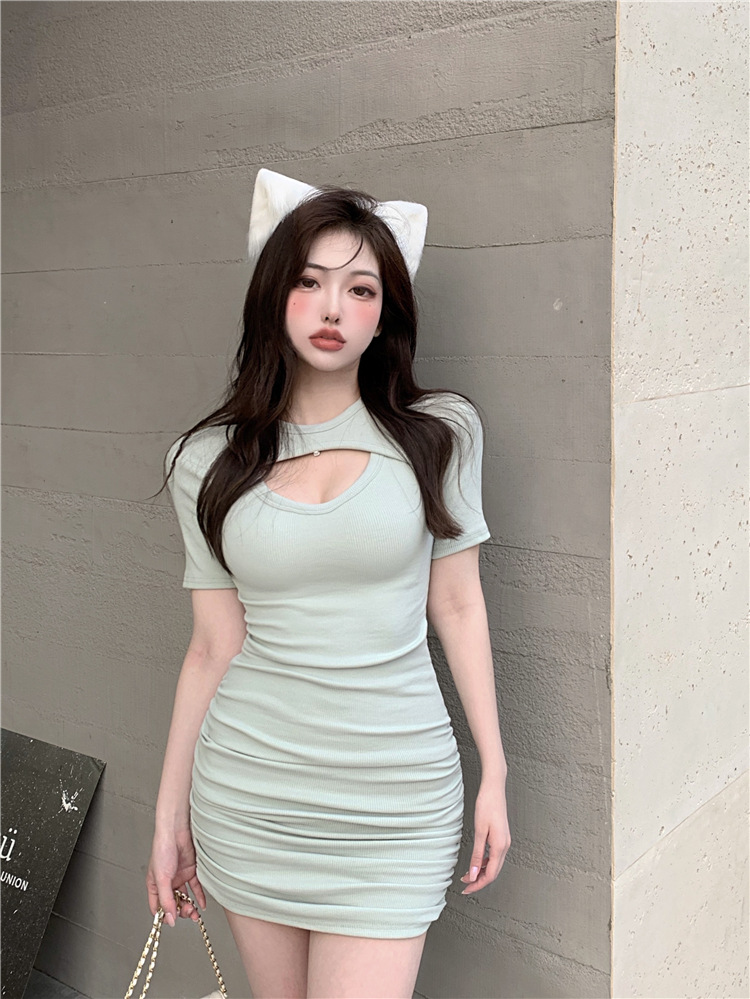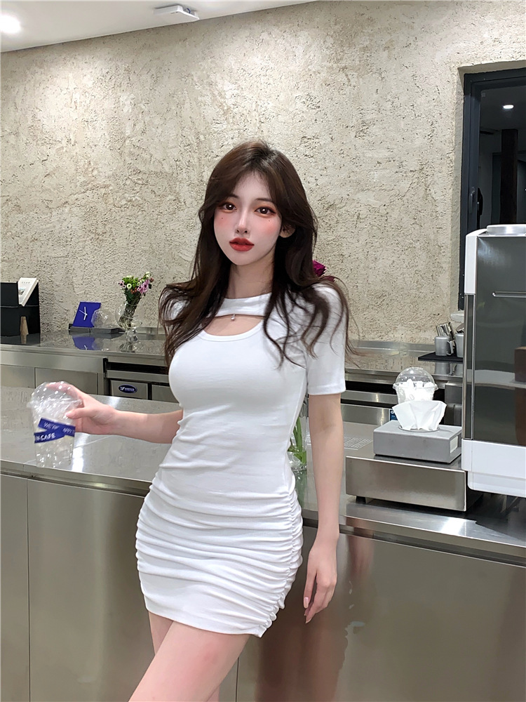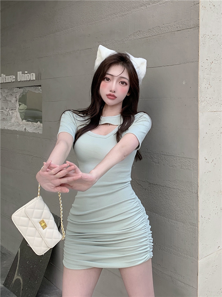 韩系chic纯色高腰褶皱包臀短裙小个子修身仙女裙夏镂空连衣裙