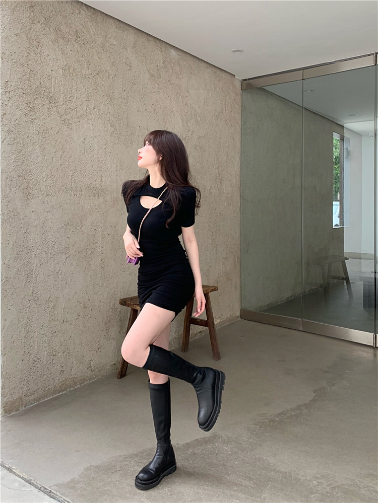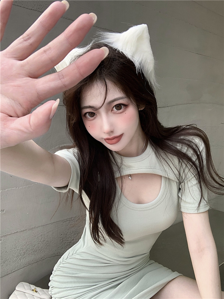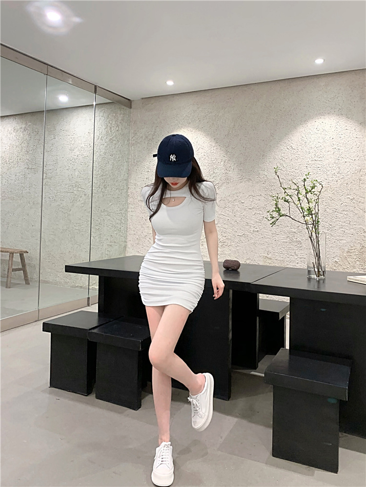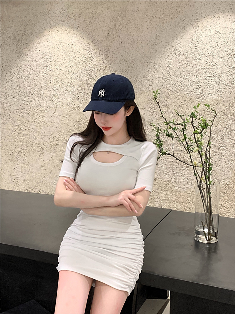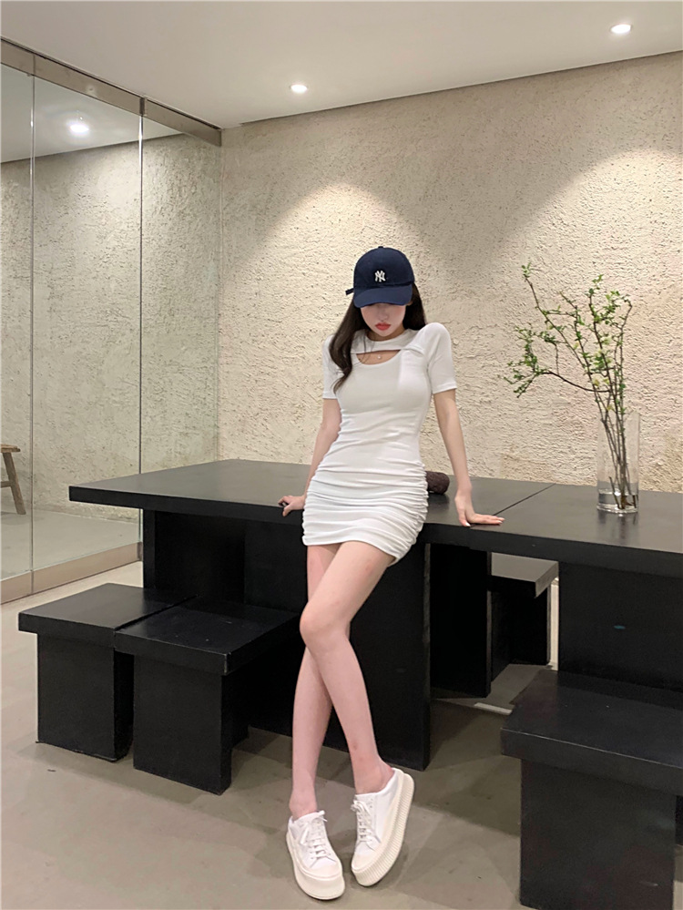 韩系chic纯色高腰褶皱包臀短裙小个子修身仙女裙夏镂空连衣裙