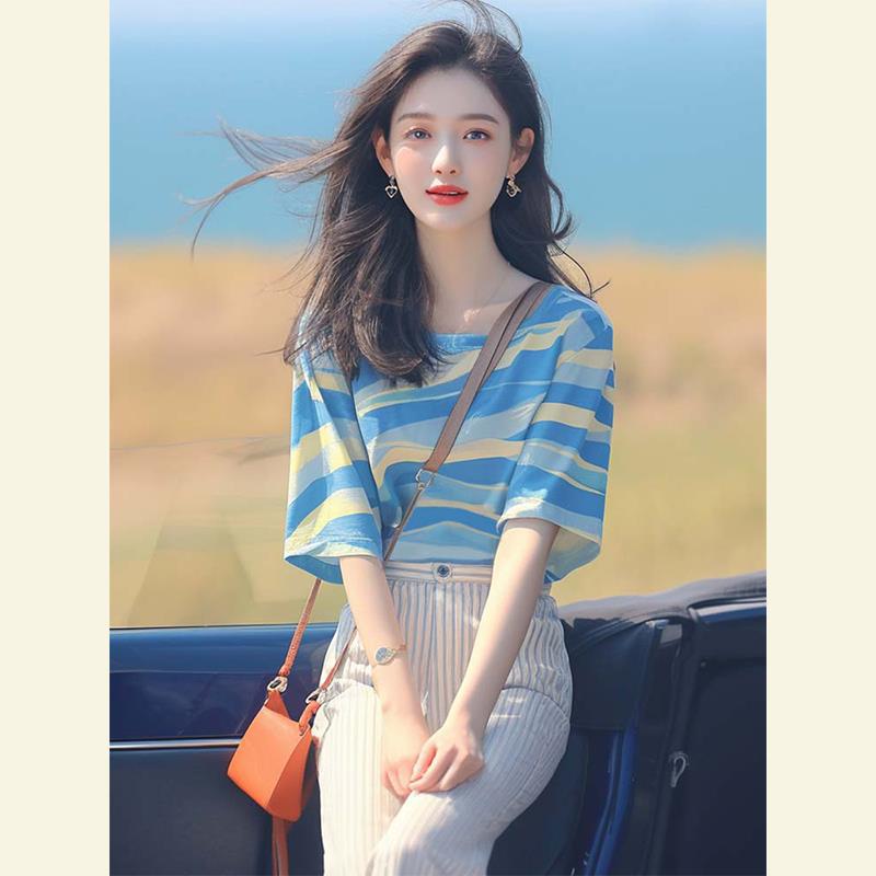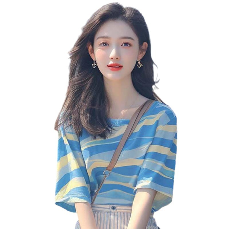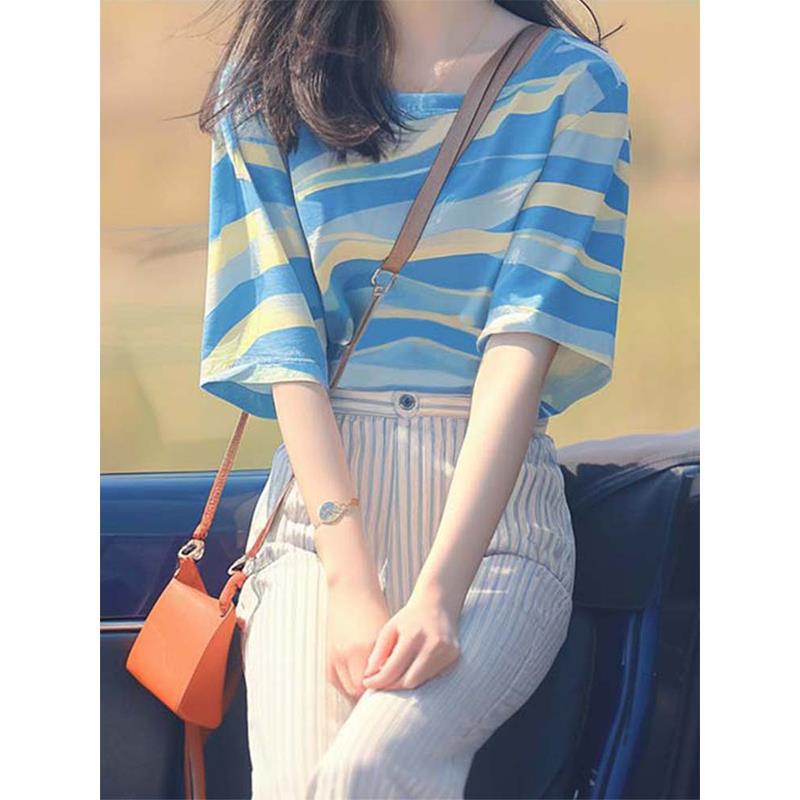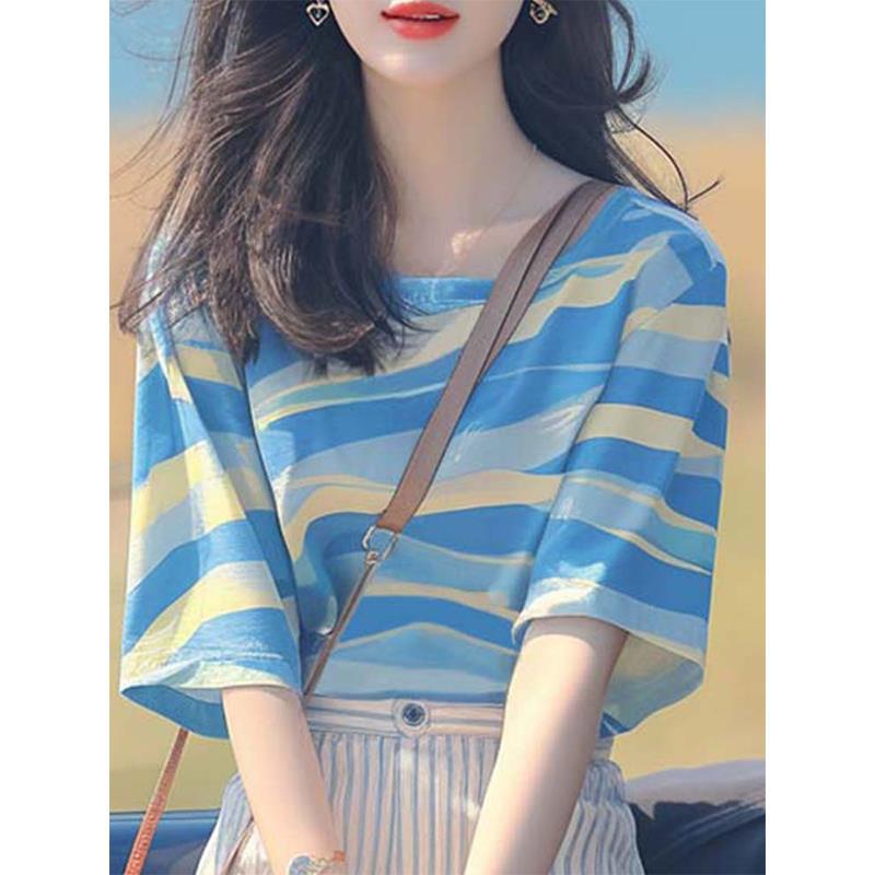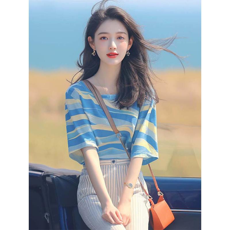 夏季韩系chic洋气独特别致漂亮上衣宽松百搭显瘦蓝色条纹T恤女款