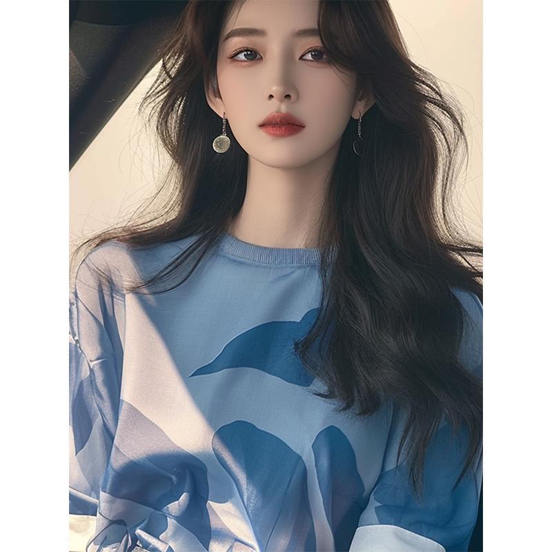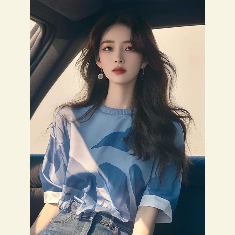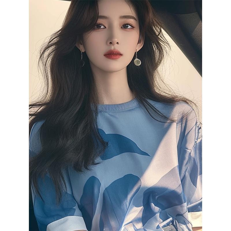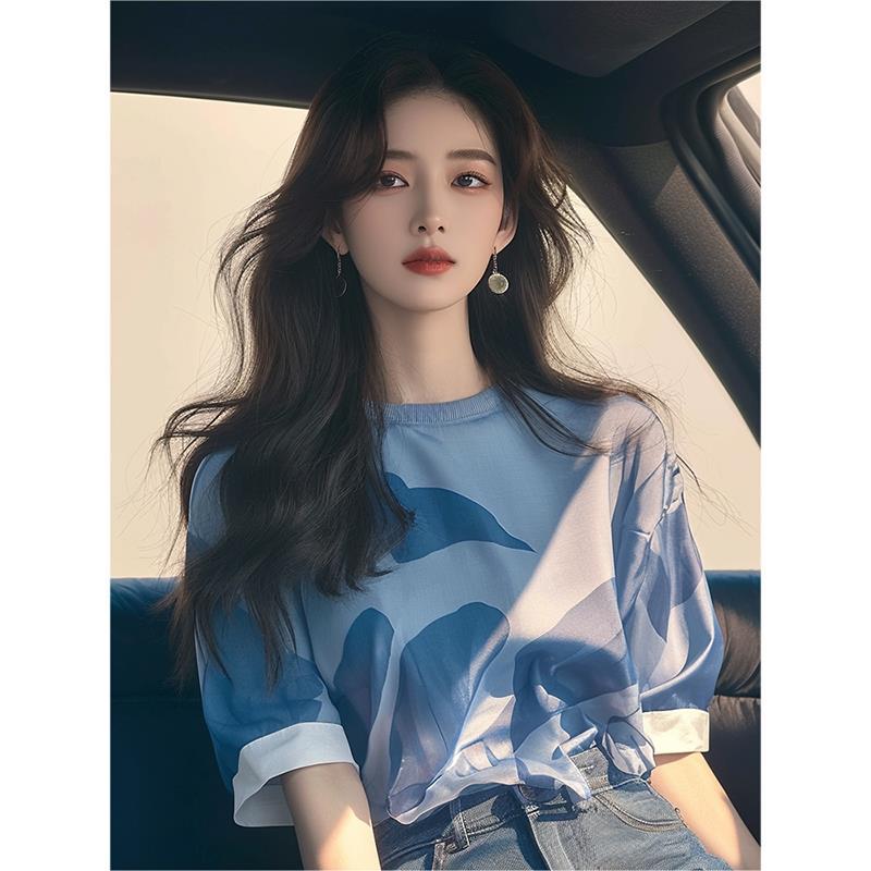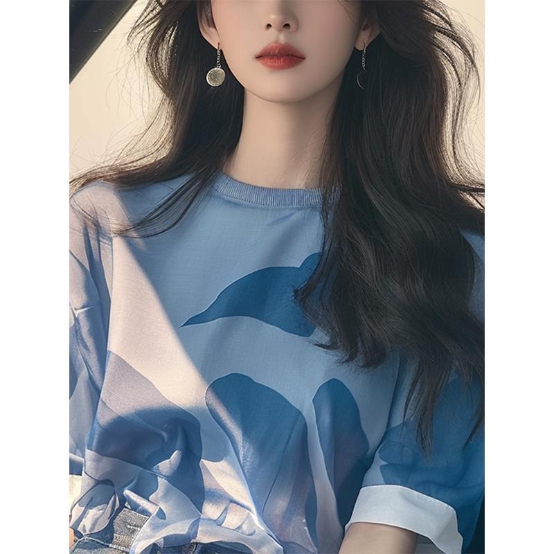 洋气独特别致小上衣超好看蓝色正肩扎染短袖女t恤新款