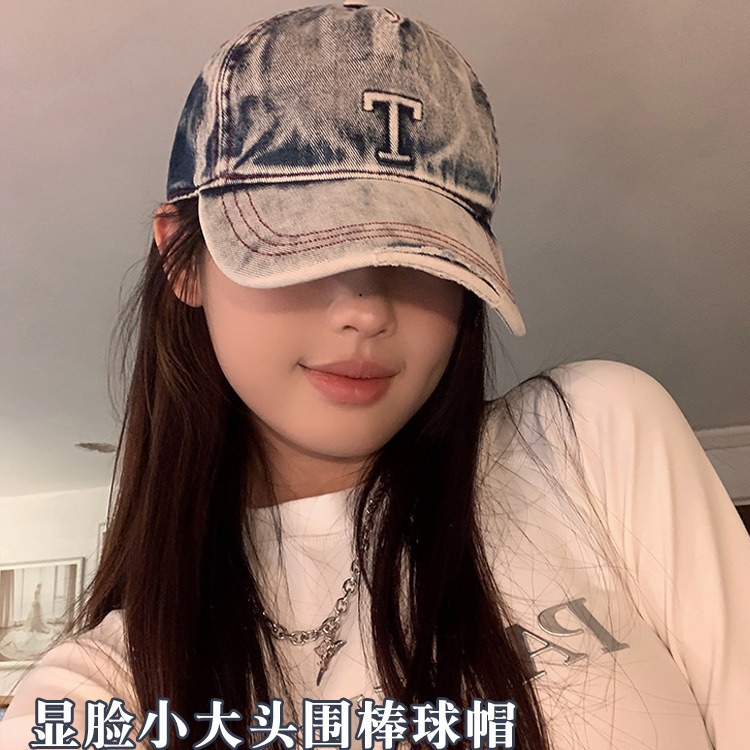 水洗做旧T字母牛仔棒球帽女春夏款百搭休闲显脸小大头围鸭舌帽男