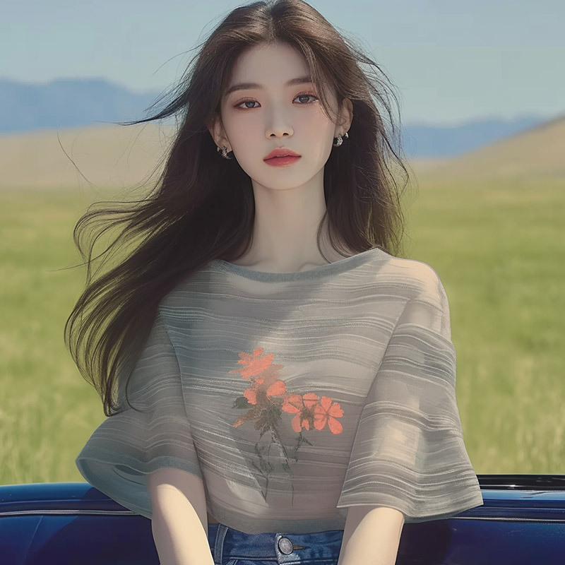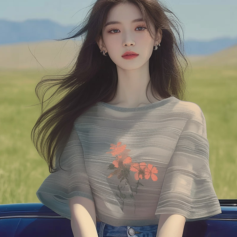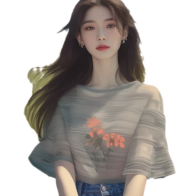 今年流行爆款独特洋气减龄上衣小众高端时髦灰色条纹印花雪纺T恤