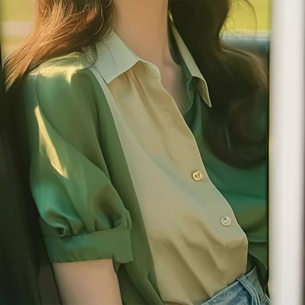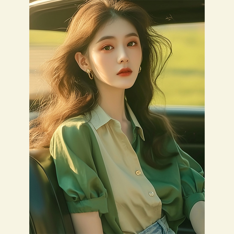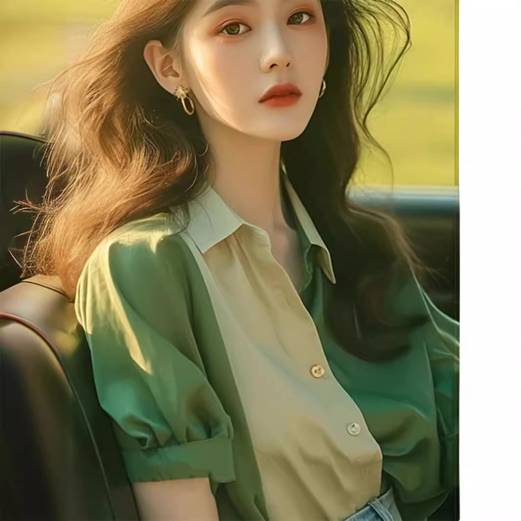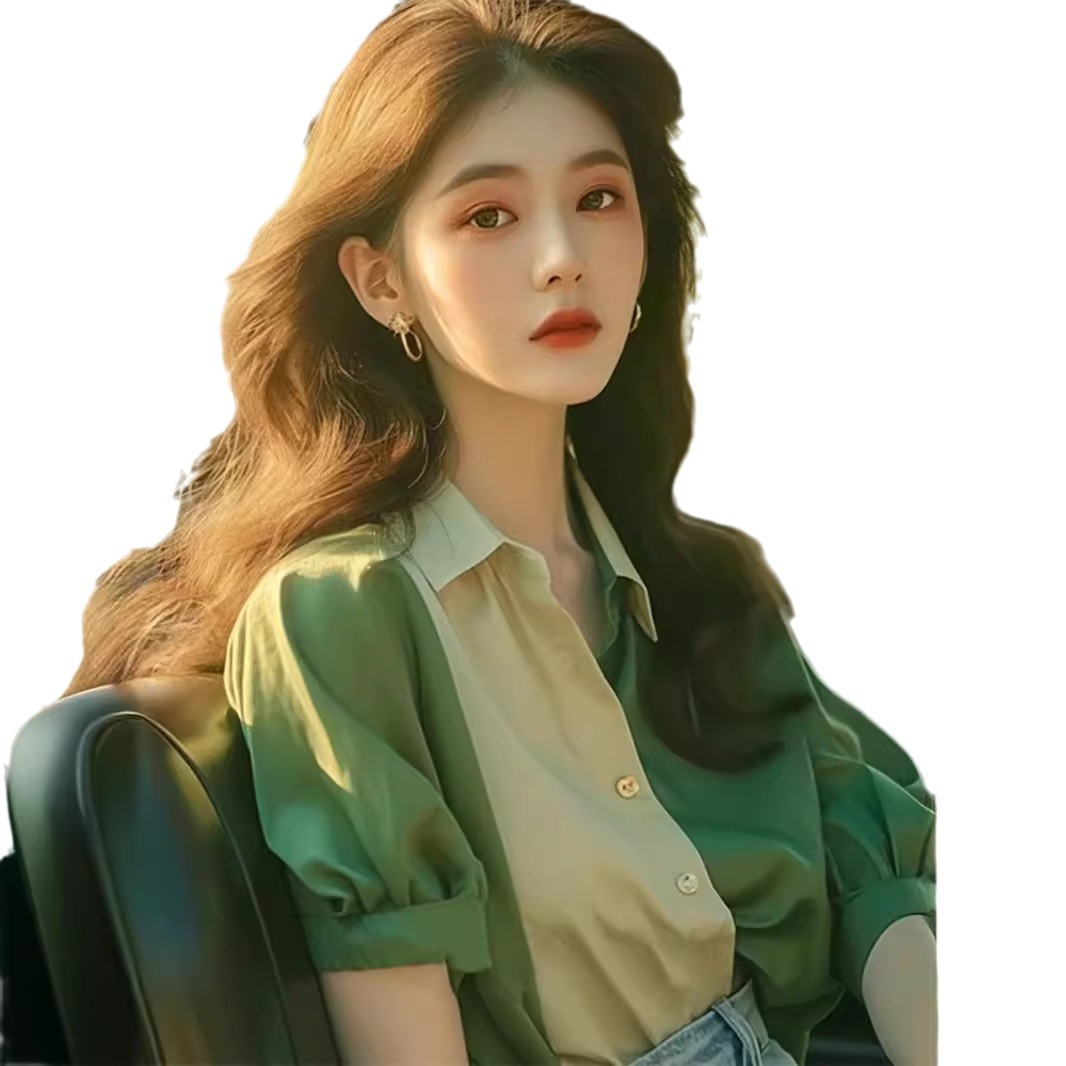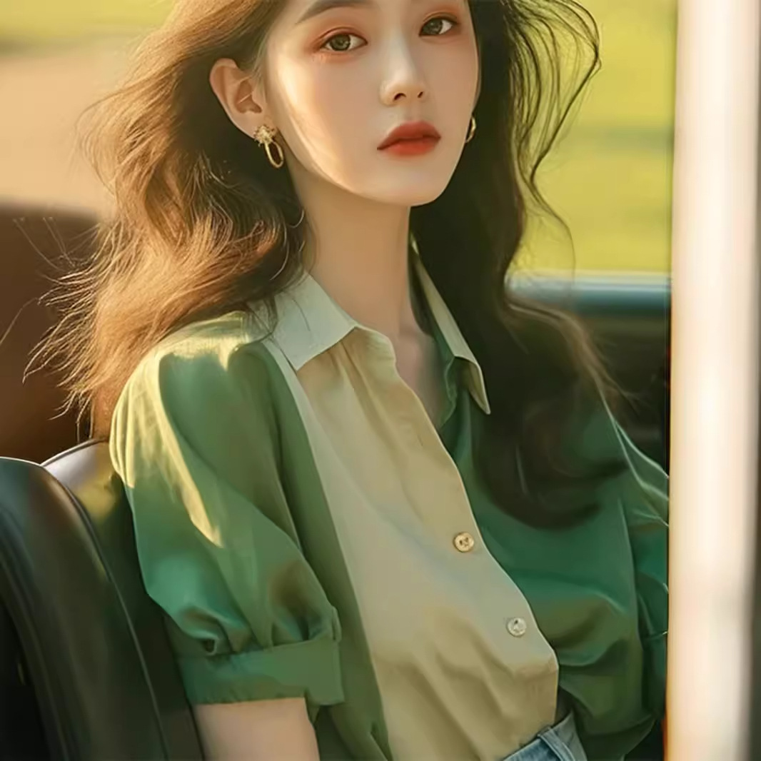 今年流行爆款绿色拼接短袖衬衫法式气质上衣洋气高端别致小衫女夏