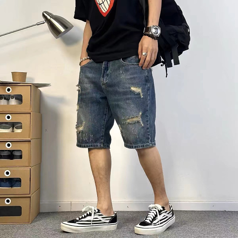 复古破洞牛仔短裤男夏季潮流宽松直筒五分裤刮烂做旧水洗乞丐中裤