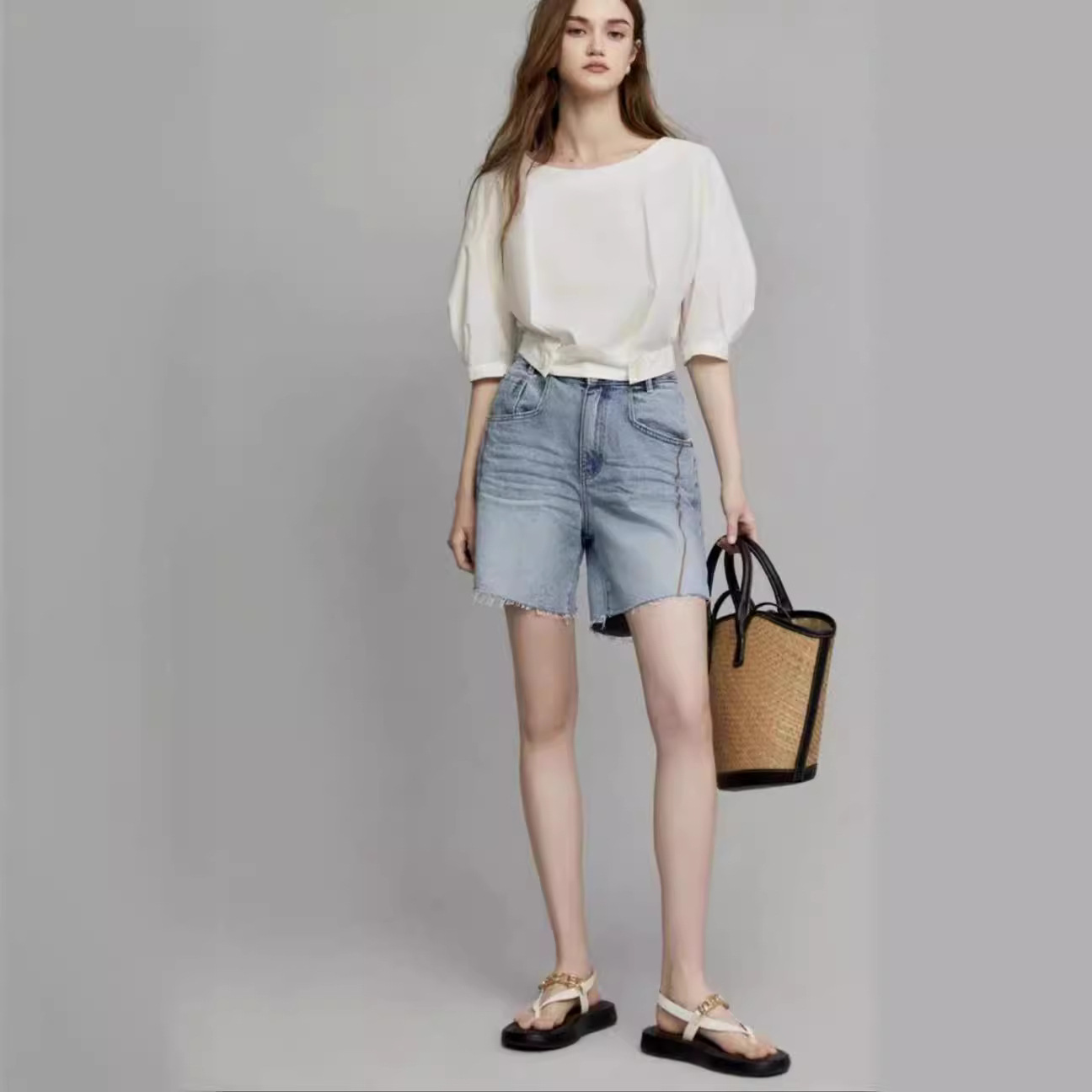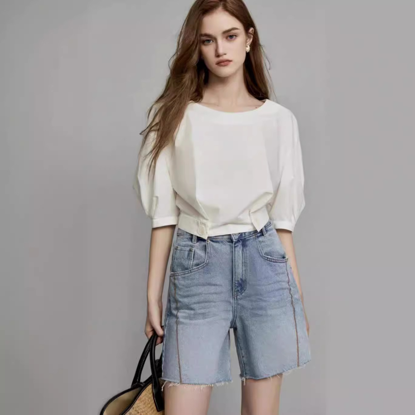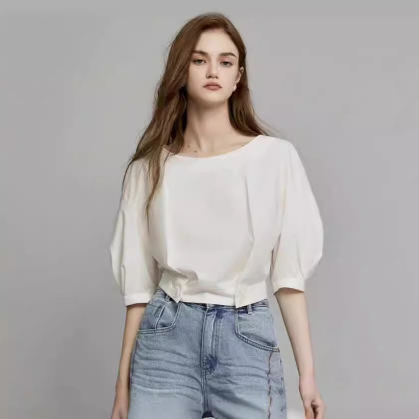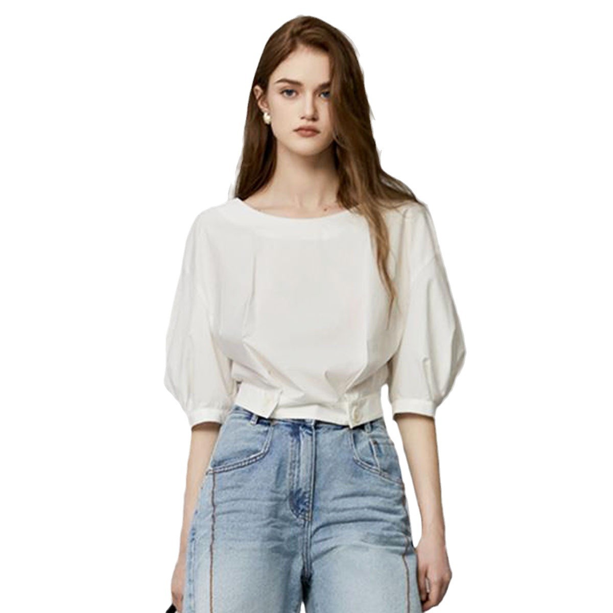 欧洲站女装夏季新款法式设计感圆领短袖衬衫别致薄款宽松上衣