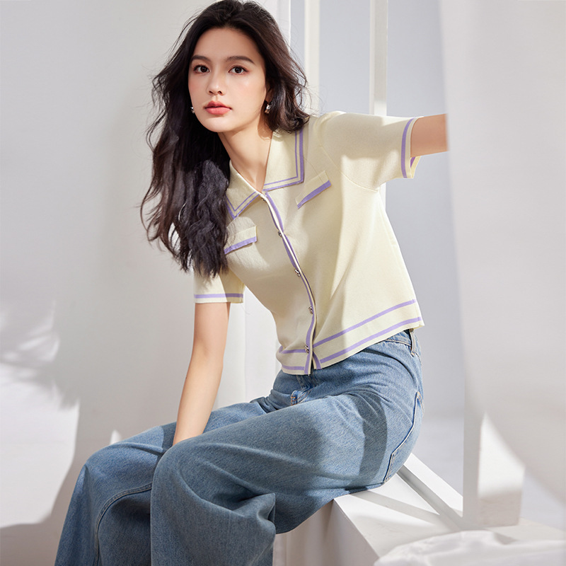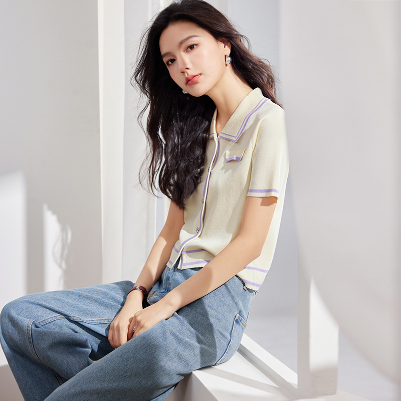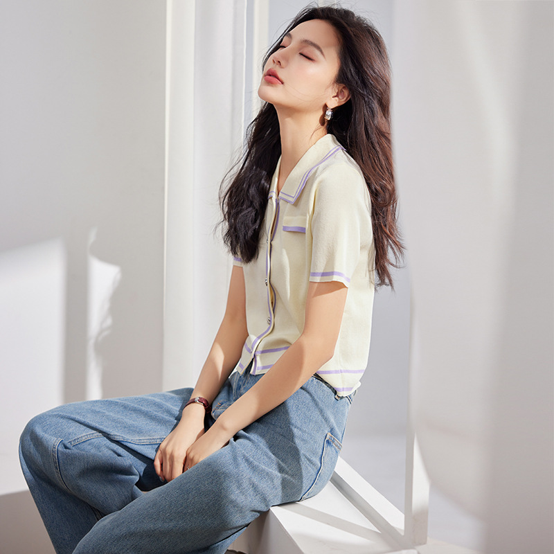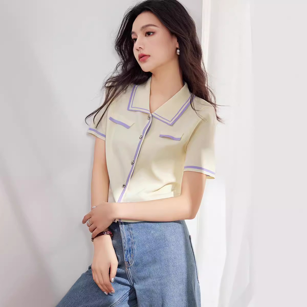 夏季新款杏色针织短袖衬衣女小个子修身撞色polo领气质上衣