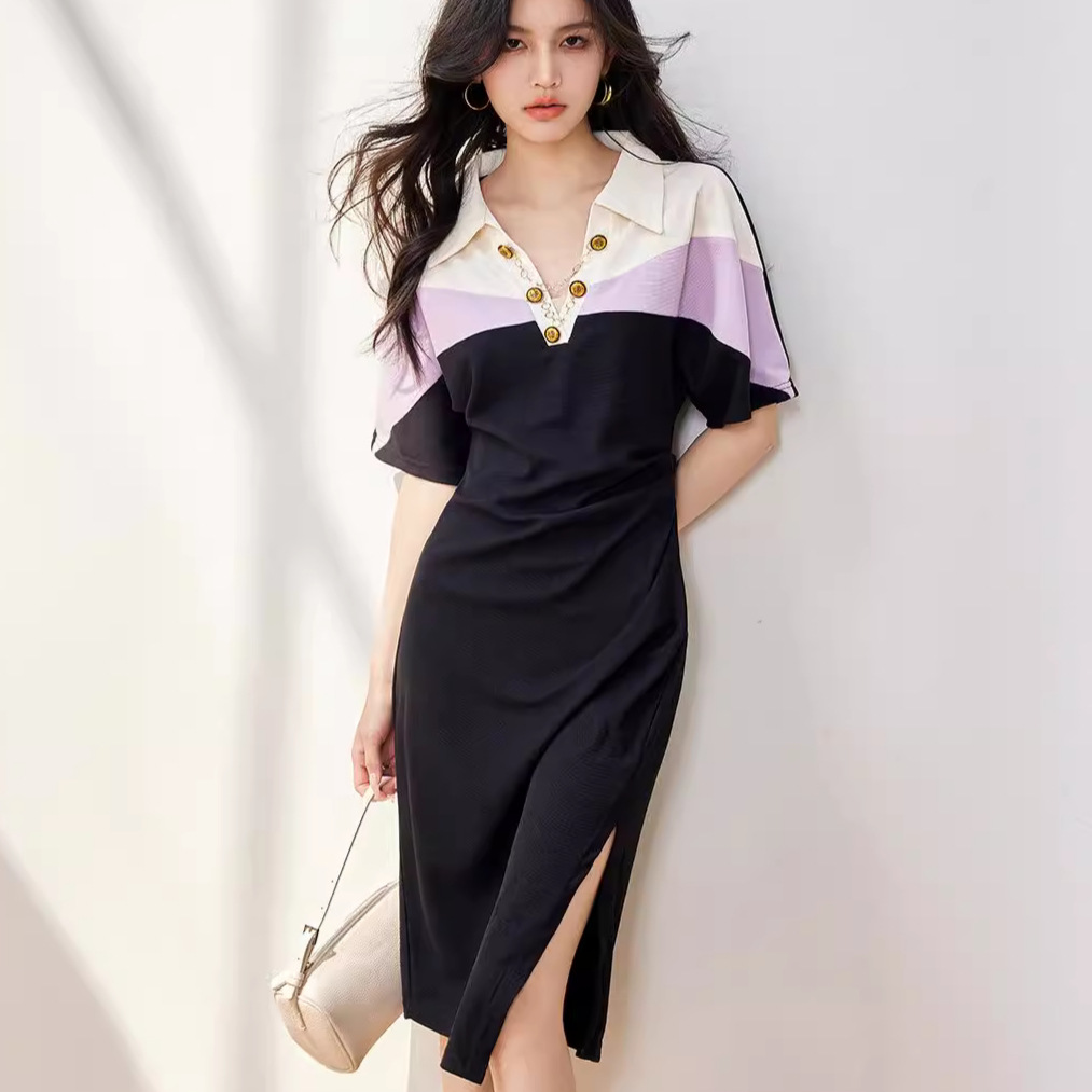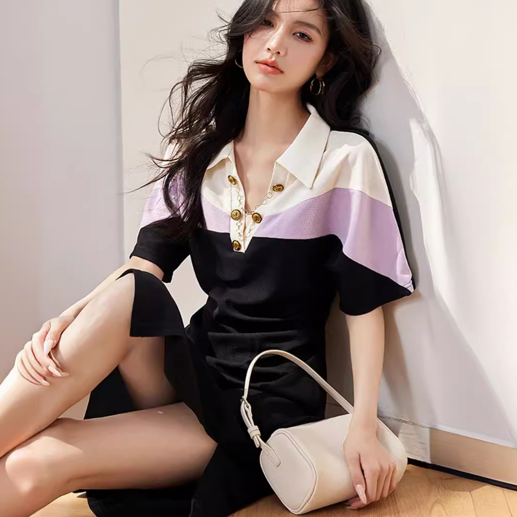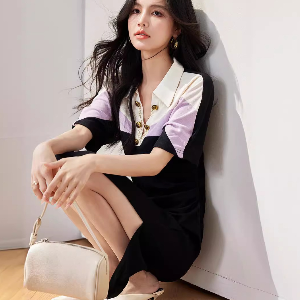 拼色优雅运动POLO连衣裙女长款修身收腰高级感短袖休闲裙夏