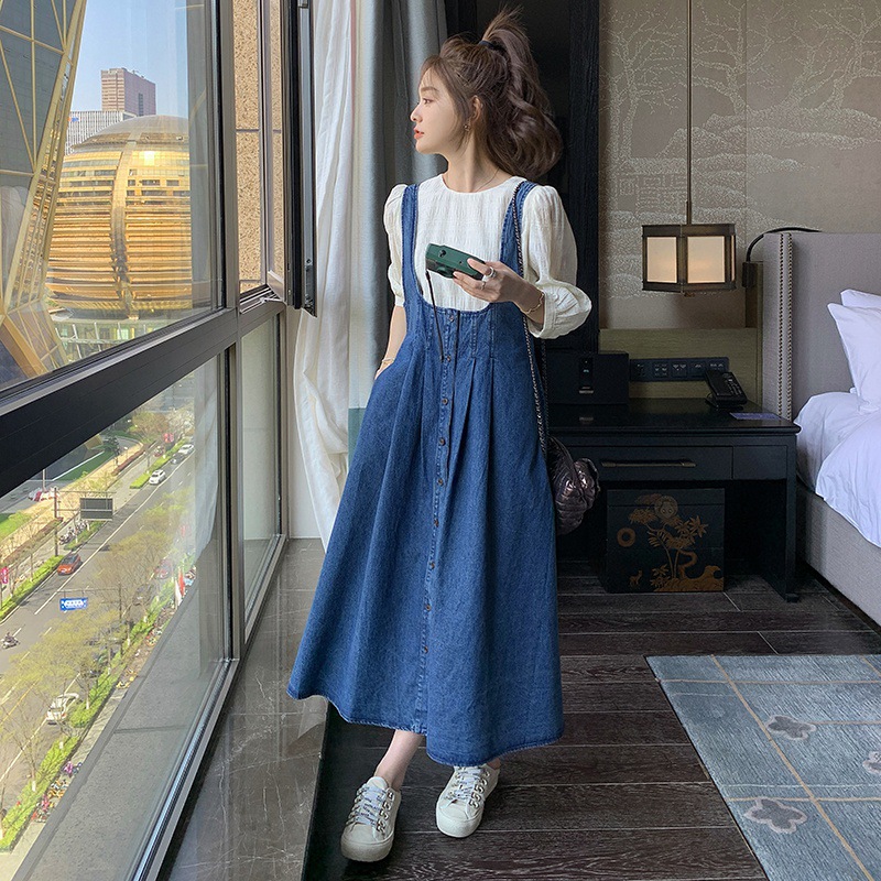 设计感牛仔背带连衣裙两件套女新款高腰A字长裙时尚休闲套装