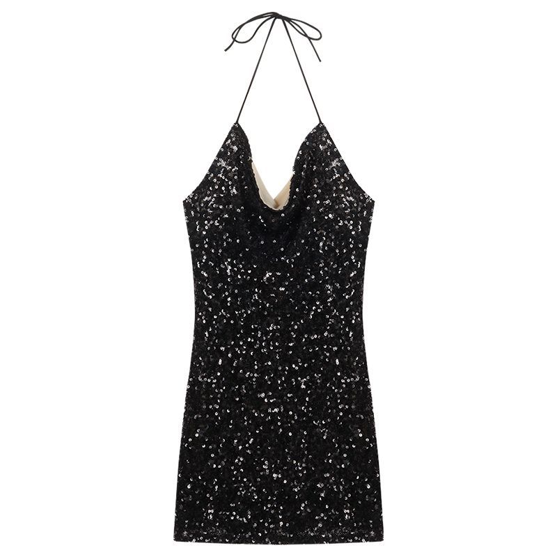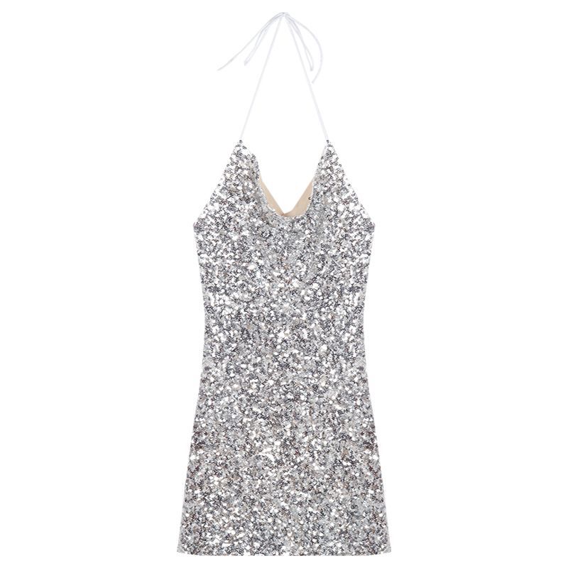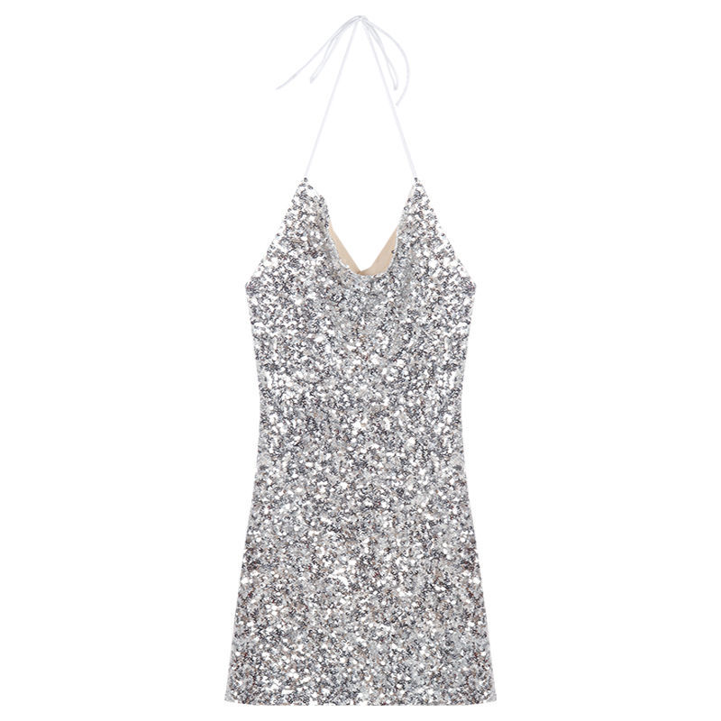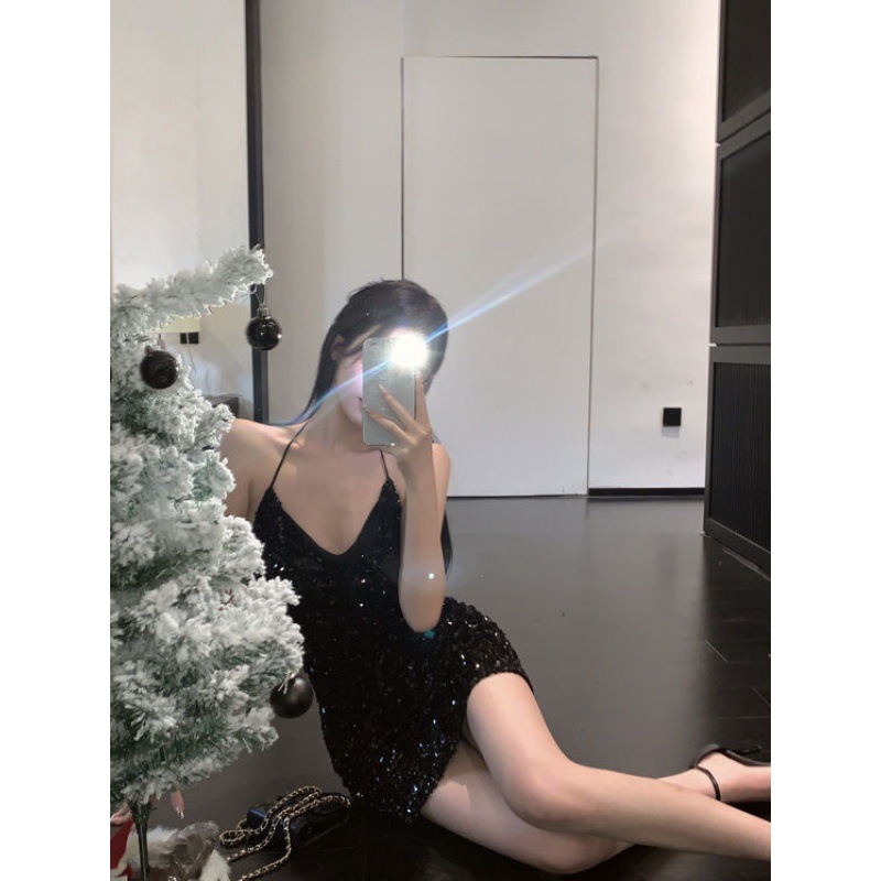 亮片挂脖吊带连衣裙女装初春年会高级感短裙纯欲露背性感包臀裙子