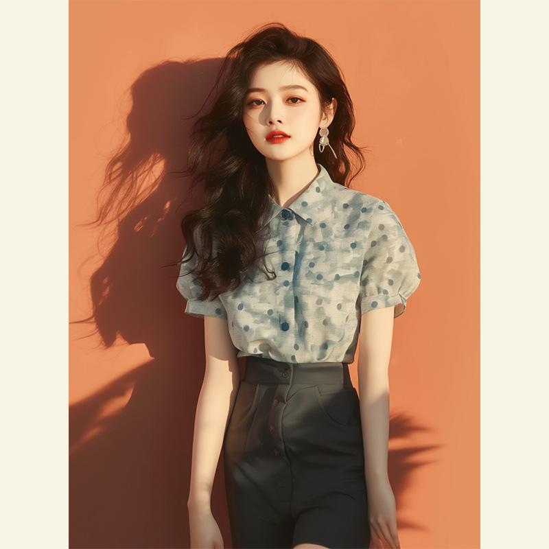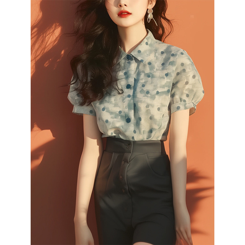 今年流行漂亮小衫独特别致绝美上衣洋气减龄印花Polo亚麻短袖衬衫