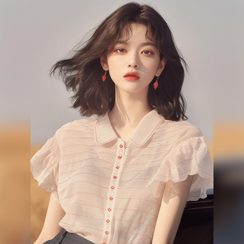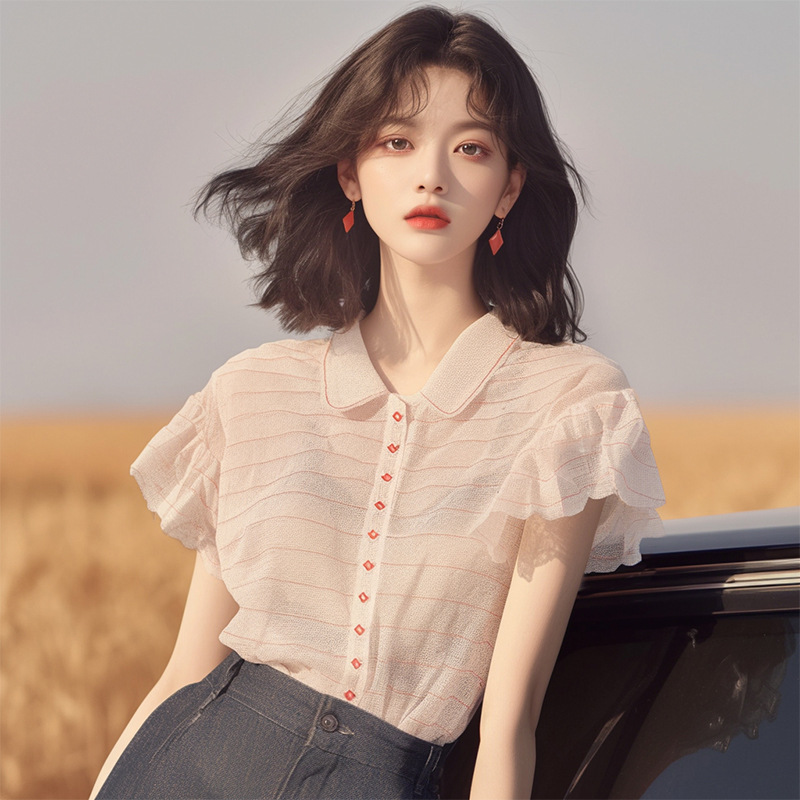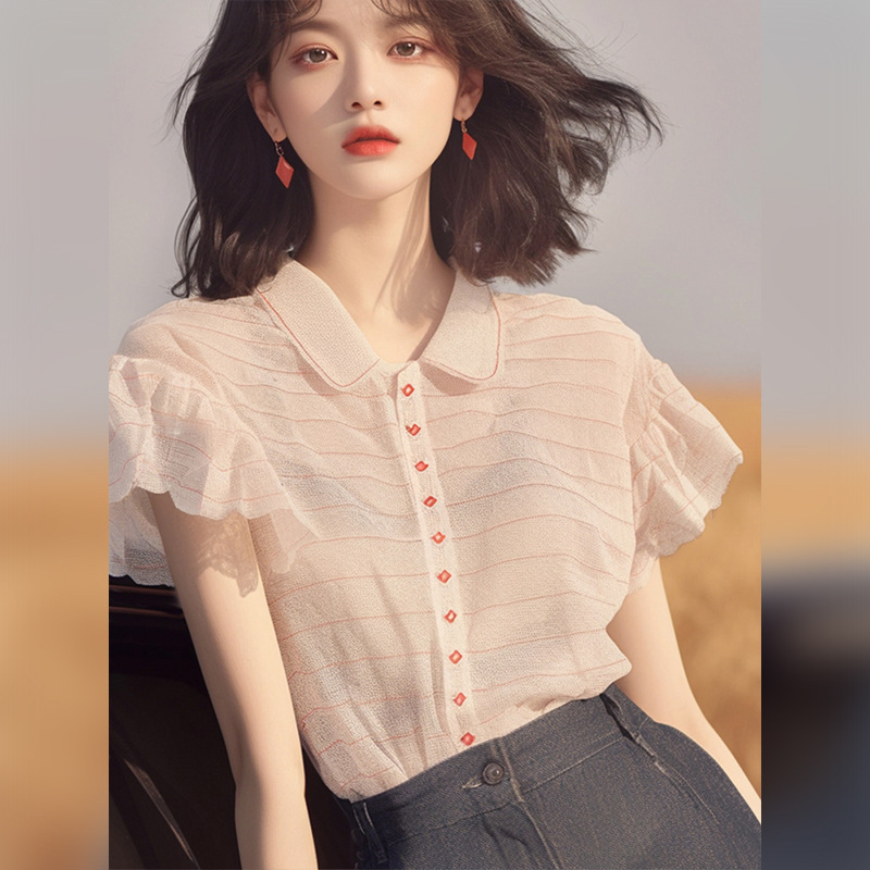 初夏流行爆款小众设计感衬衫法式气质绝美显瘦白色条纹小飞袖上衣