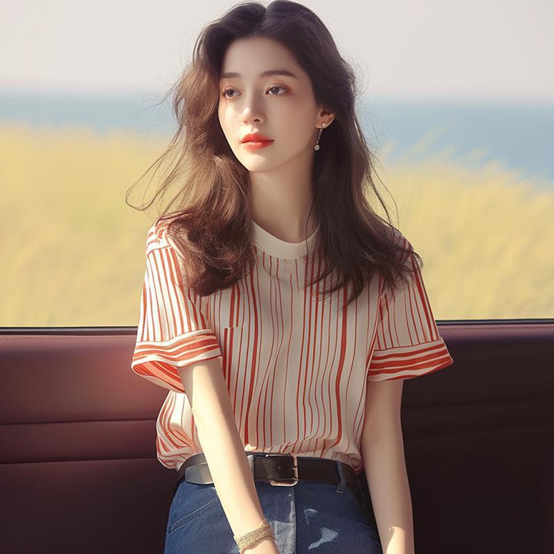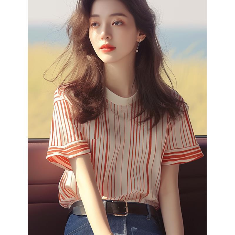 夏季韩系chic洋气独特别致漂亮上衣时尚百搭显瘦红色条纹短袖T恤
