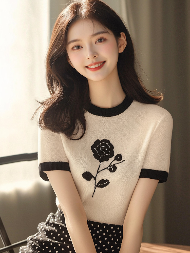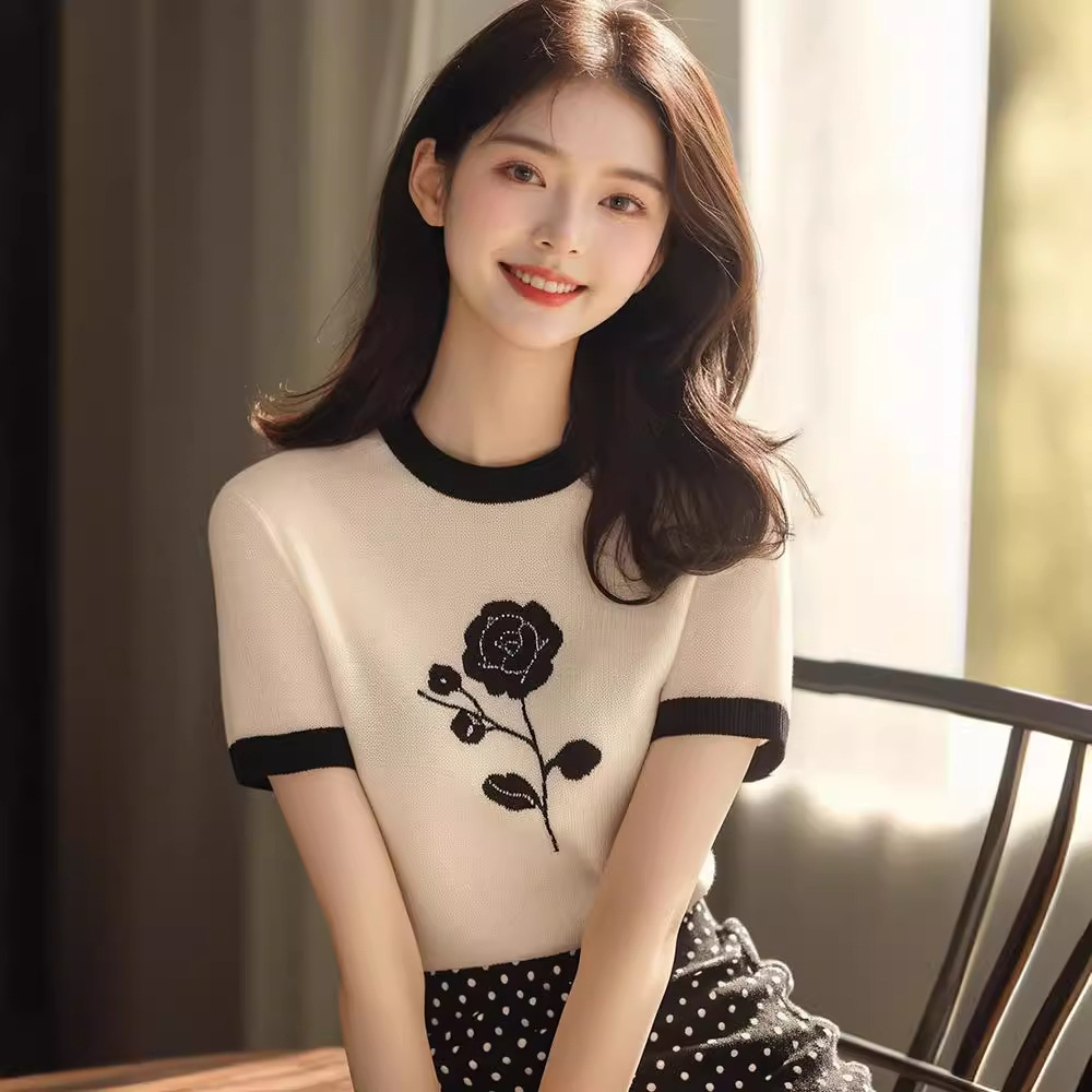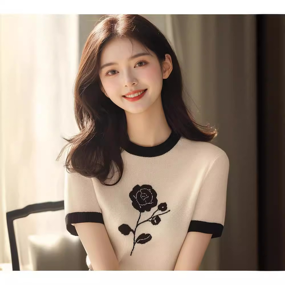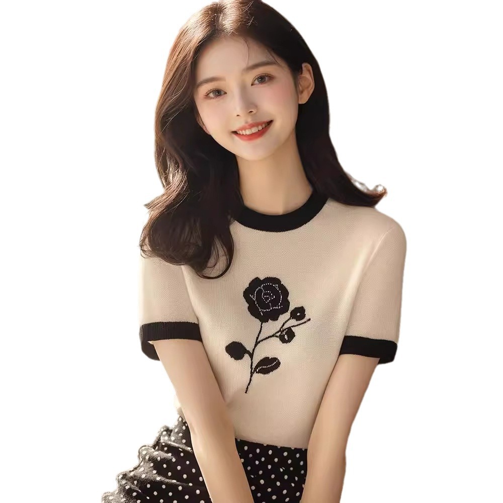 新款爆款夏季小众别致设计感上衣针织正肩冰丝短袖t恤女夏款
