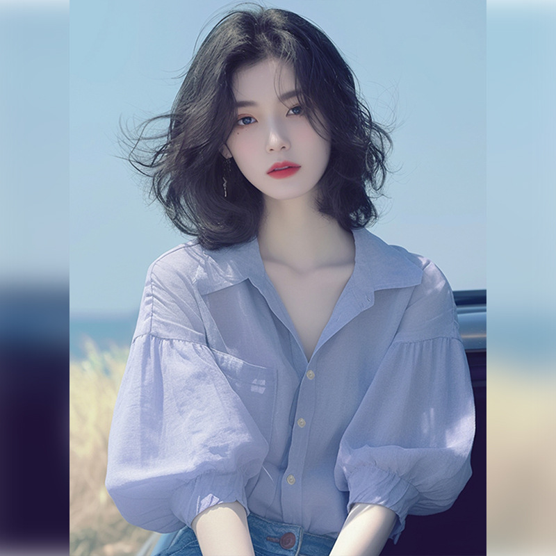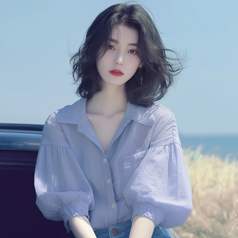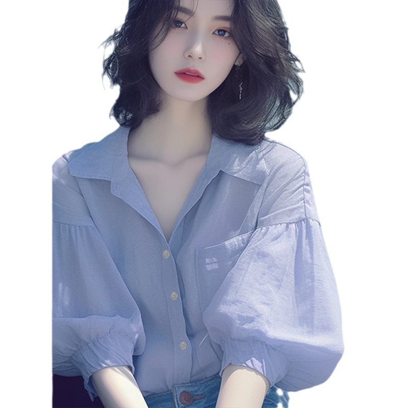 夏季韩系chic别致独特设计感紫色灯笼袖衬衫温柔气质绝美V领上衣
