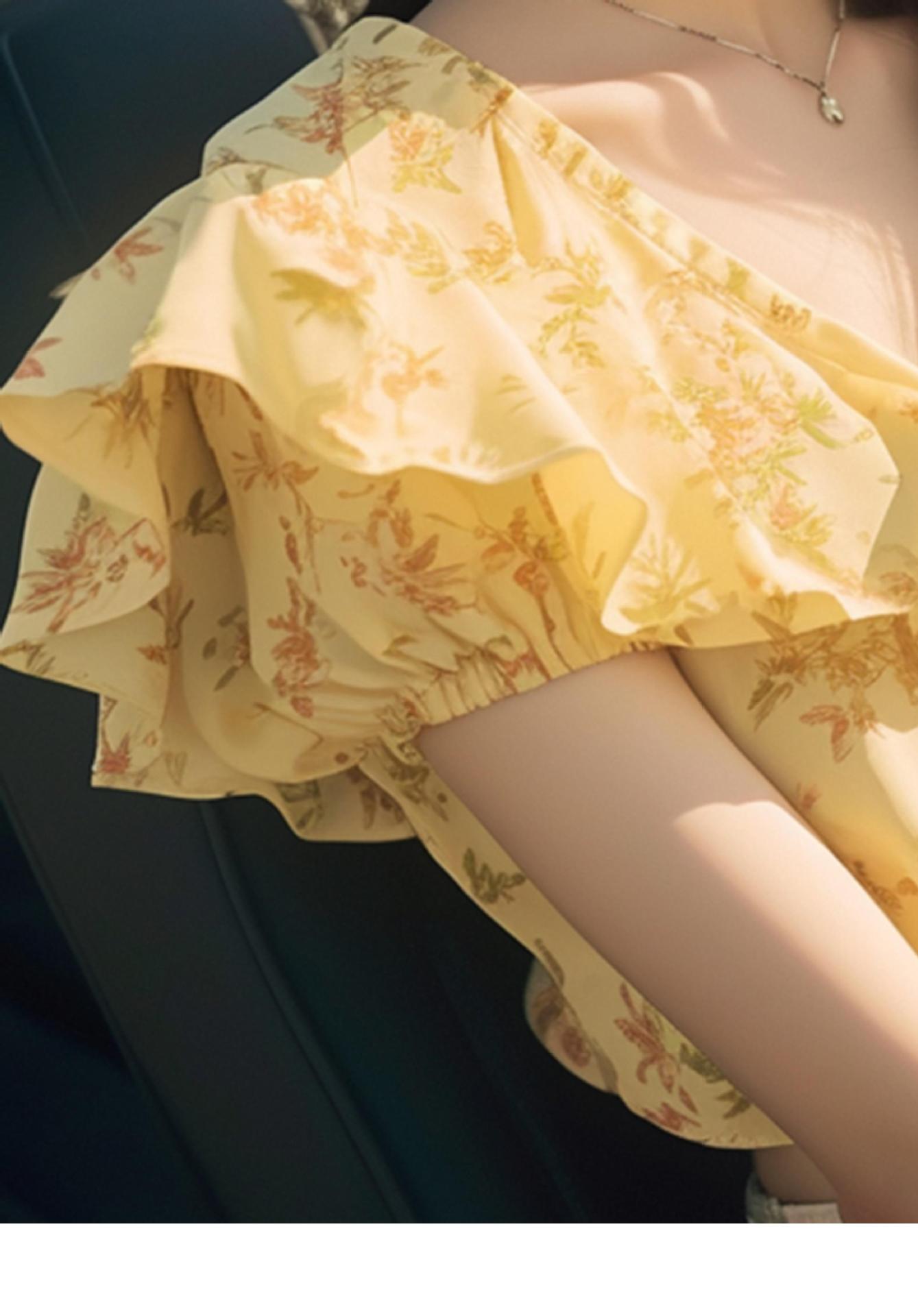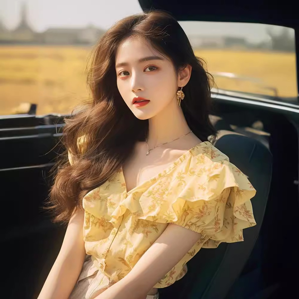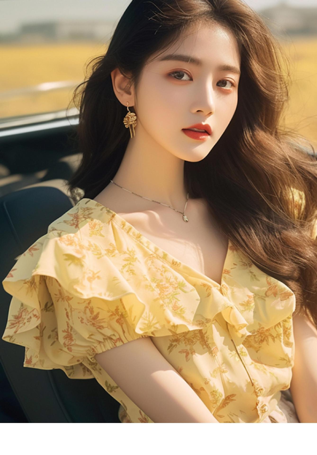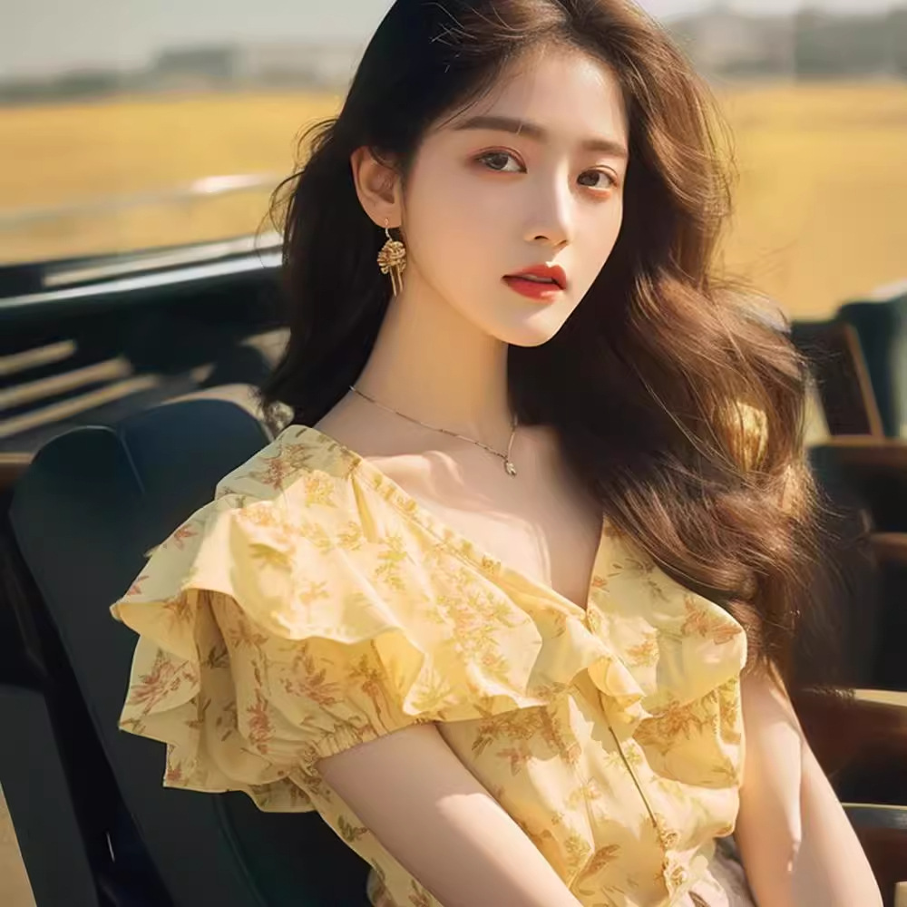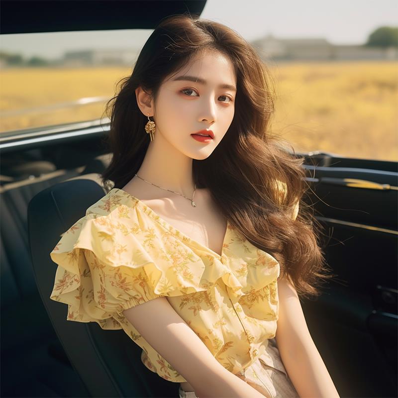 夏季高端洋气独特别致漂亮上衣减龄黄色荷叶边碎花短袖衬衫女