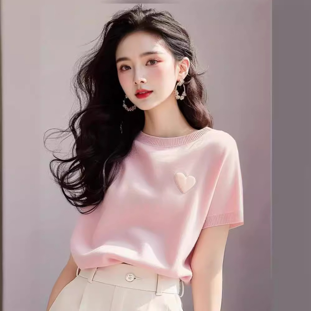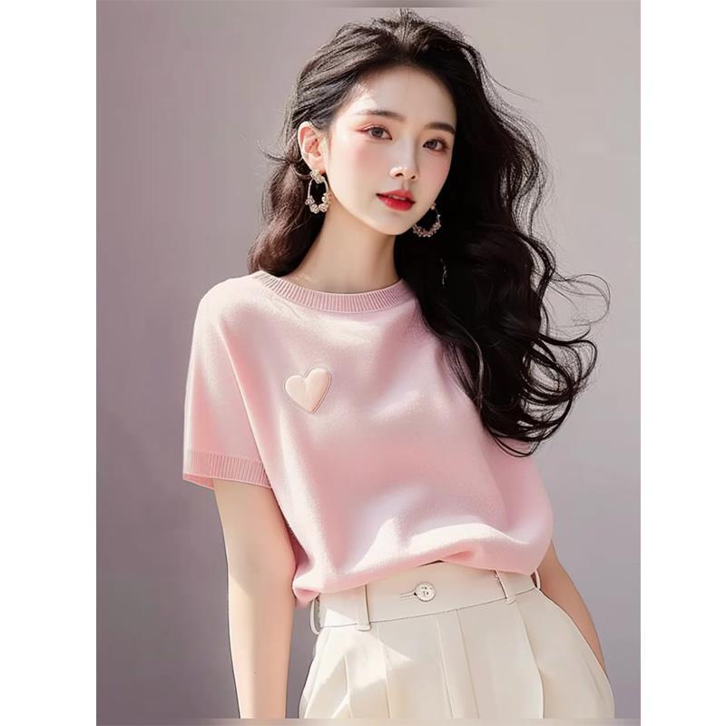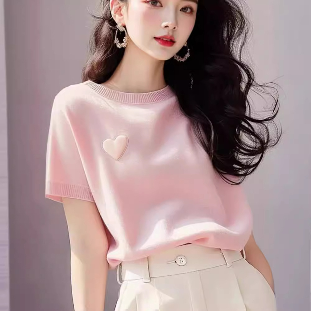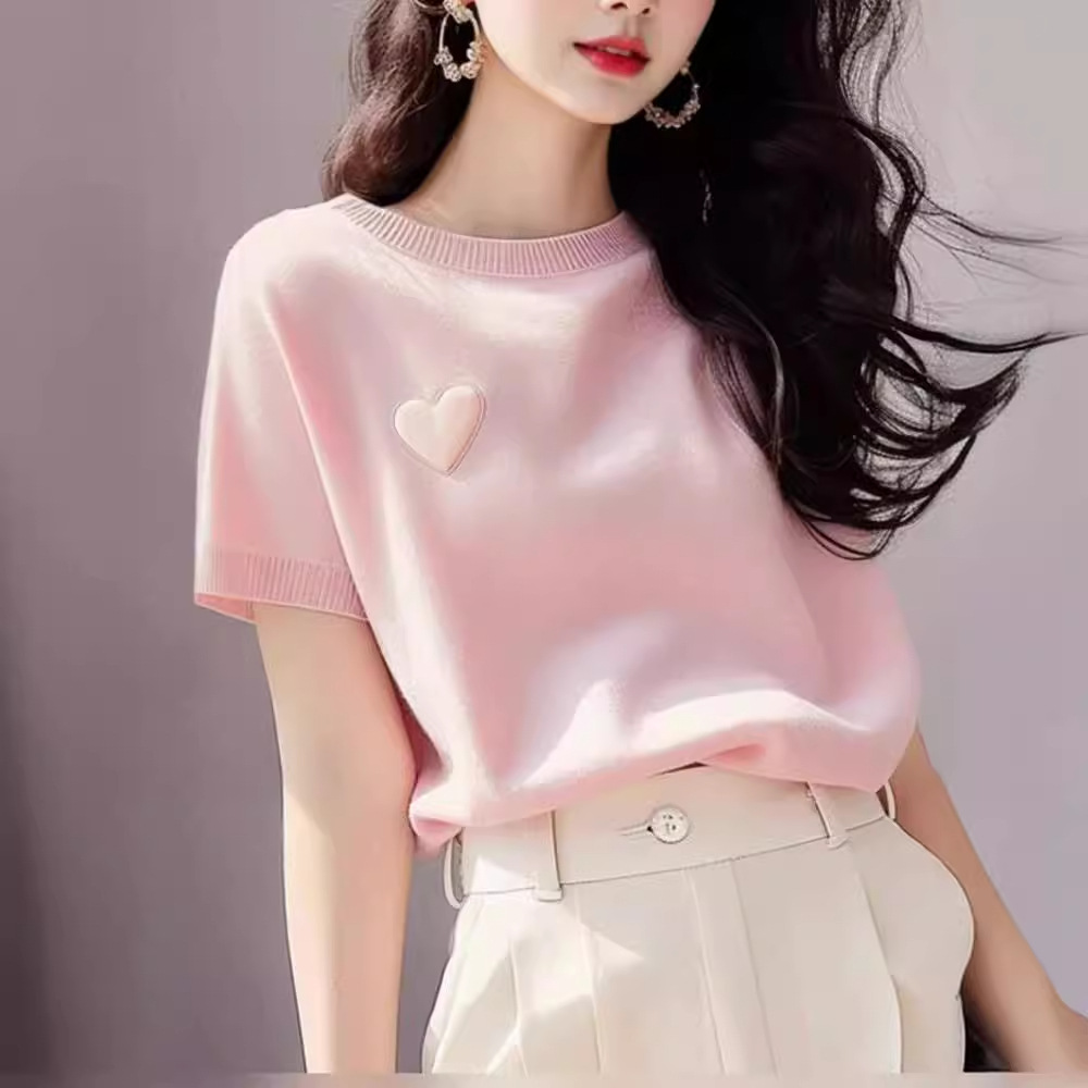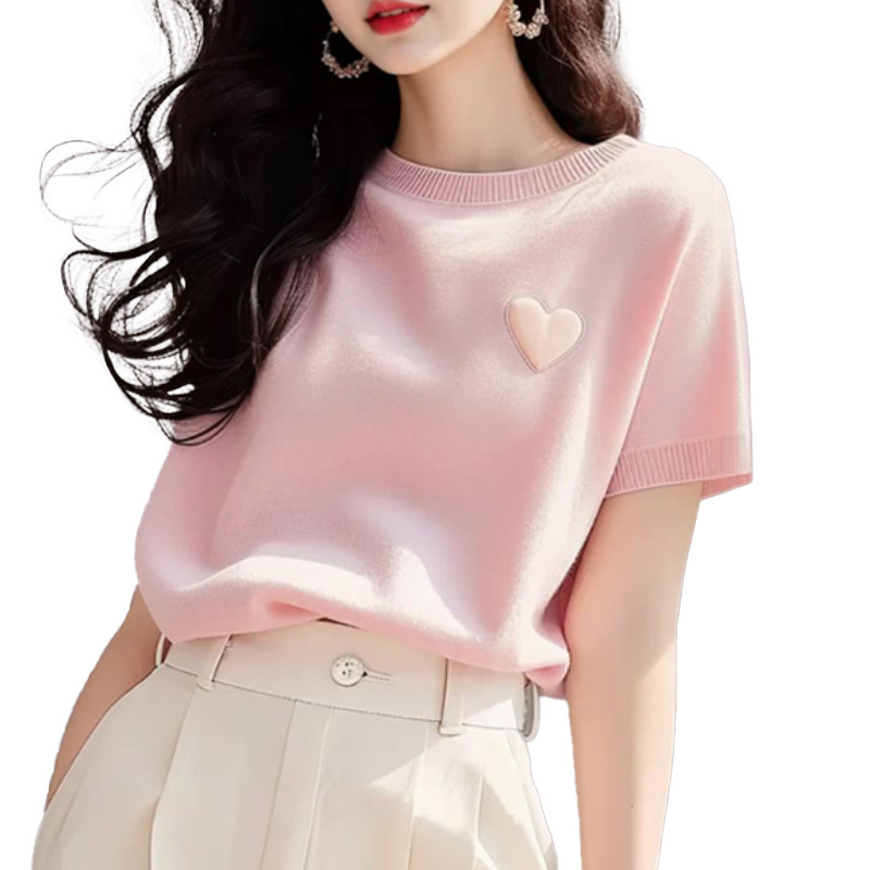 小众设计休闲上衣法式轻熟超好看粉色短袖爱心正肩短袖t恤女夏季