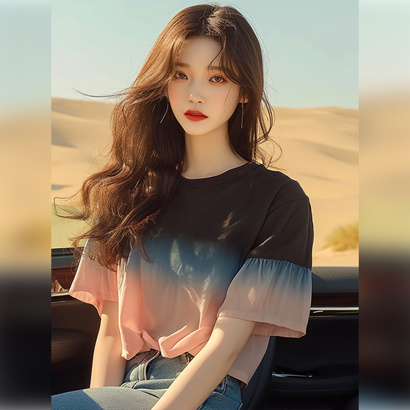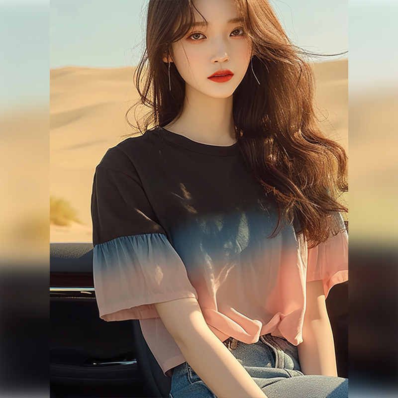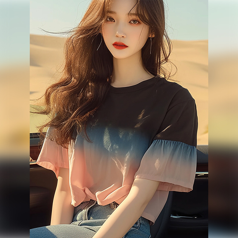 夏季独特别致漂亮上衣女夏小众时髦洋气遮肚显瘦撞色晕染短袖T恤