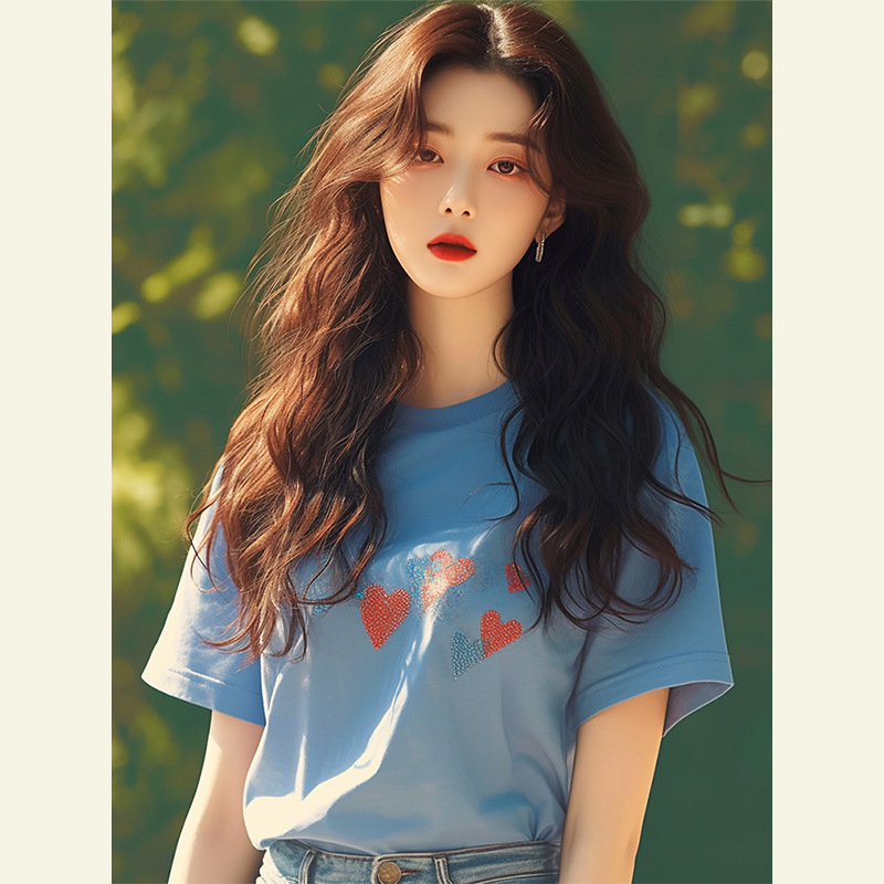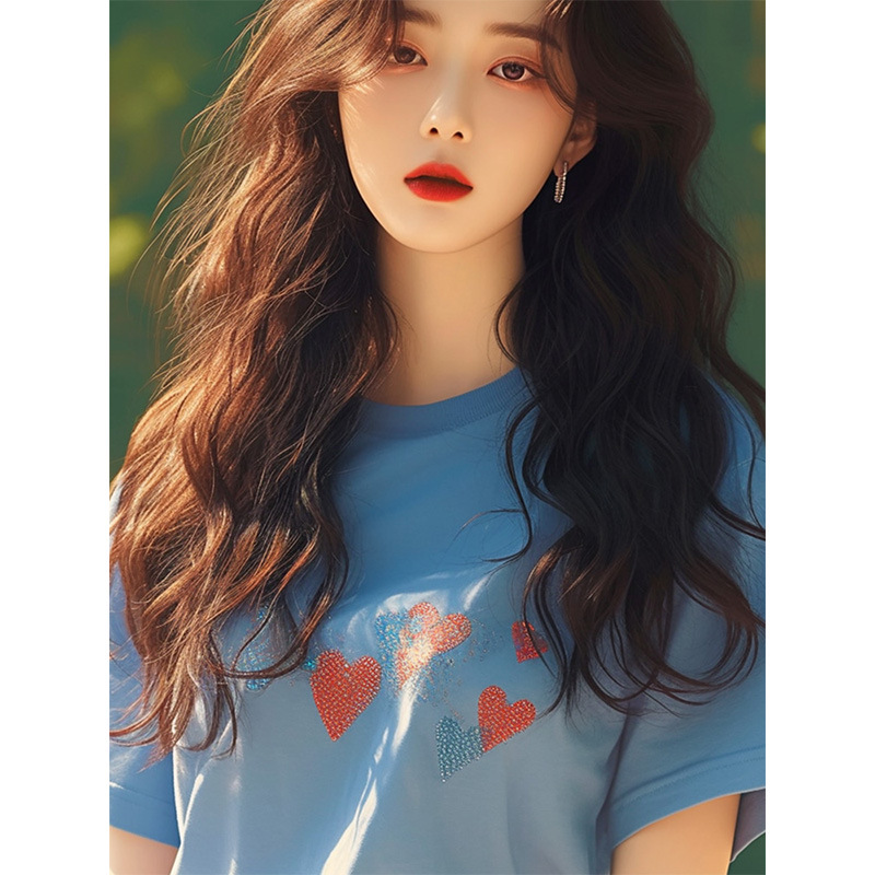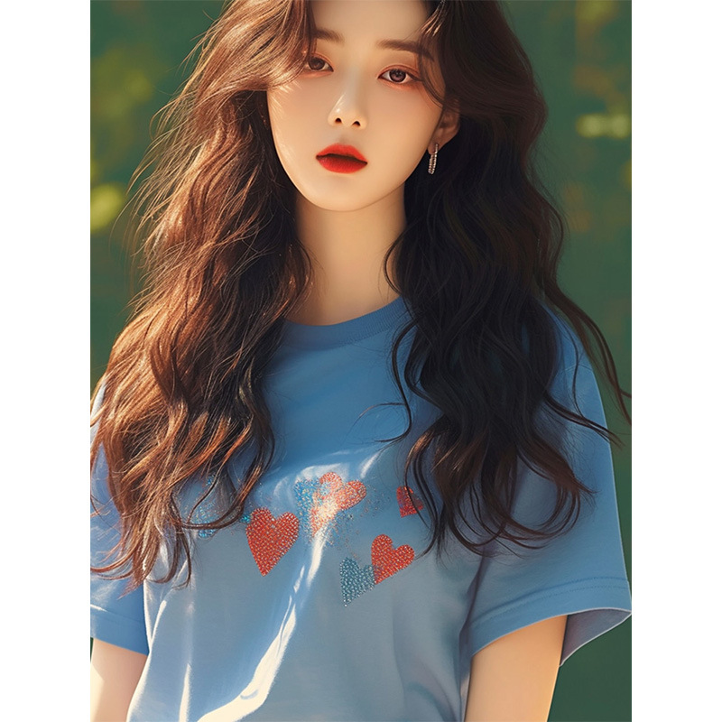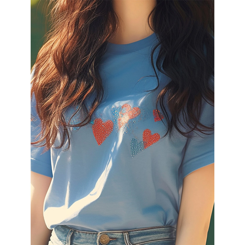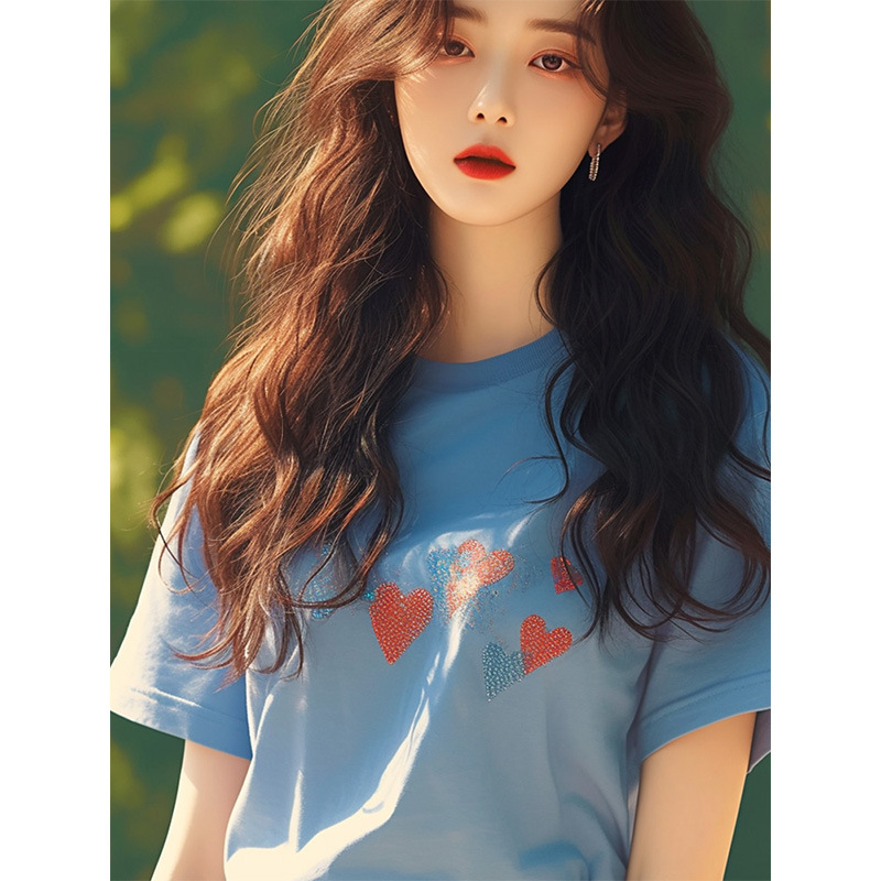 新款独特设计感上衣小众别致蓝色爱心印花正肩短袖t恤女夏季