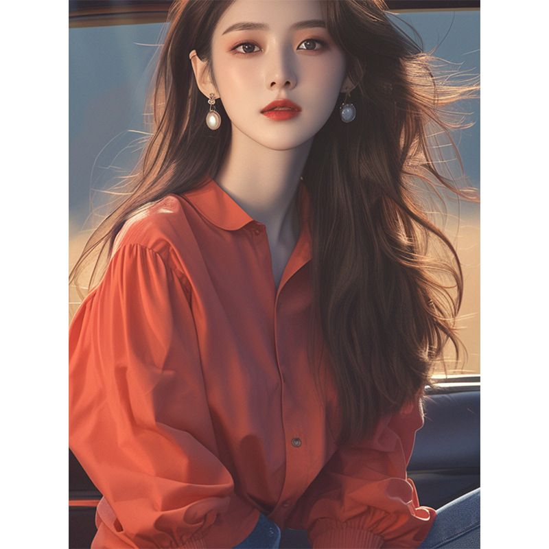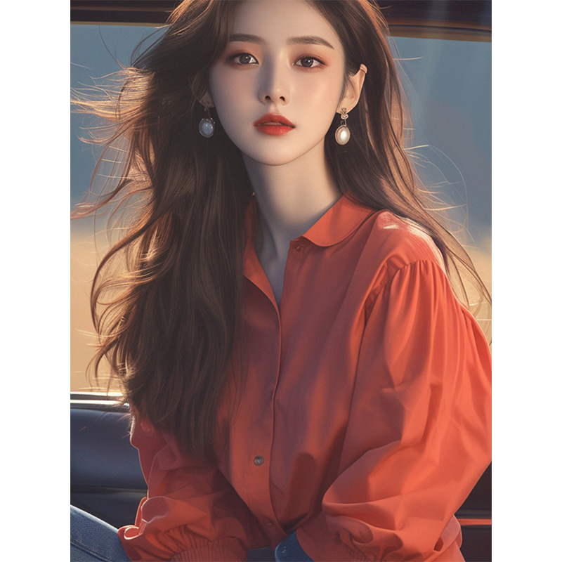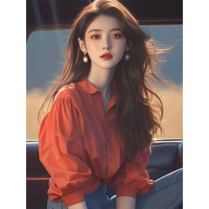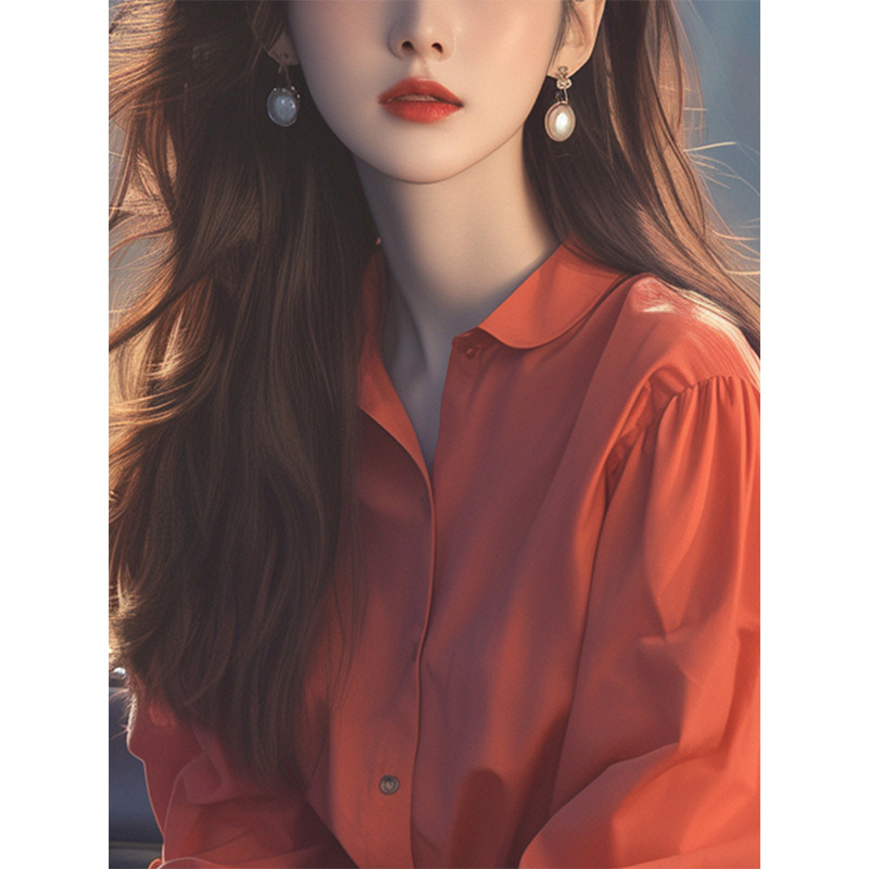 夏季韩系独特别致小衫高级感上衣洋气减龄绝美红色泡泡袖衬衫