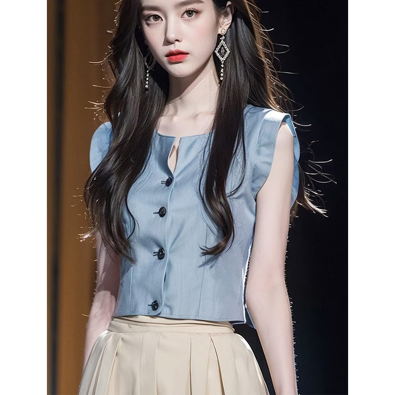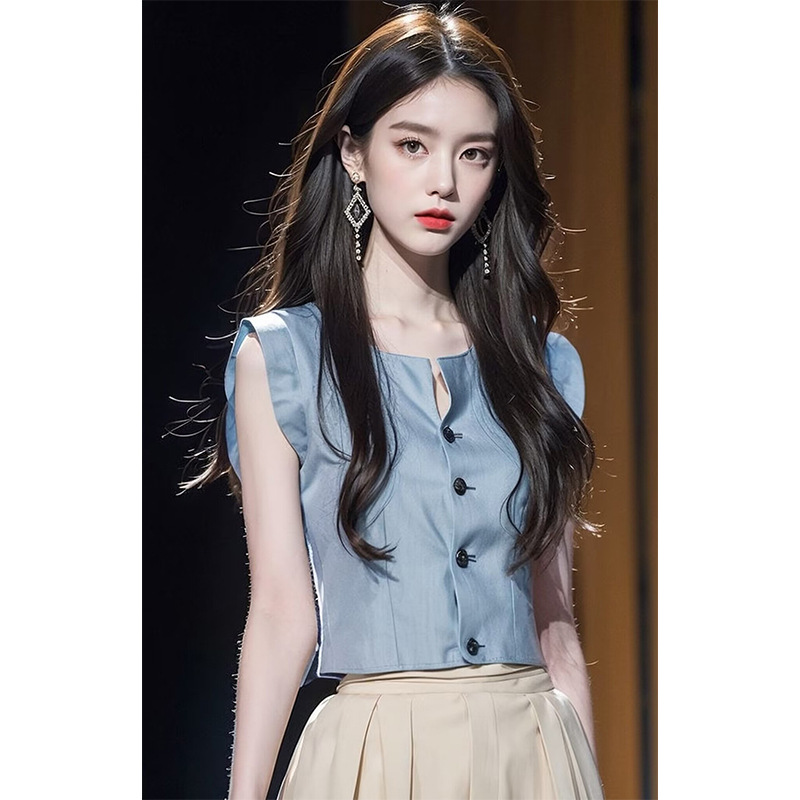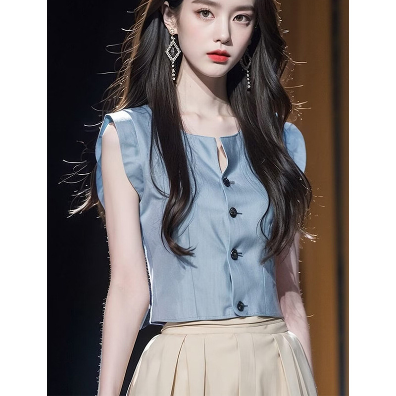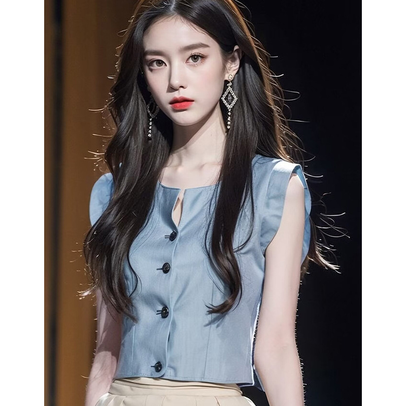 今年流行漂亮小衫冷淡系高级感气质通勤蓝色收腰背心衬衫上衣女夏