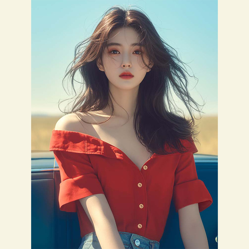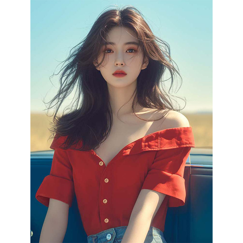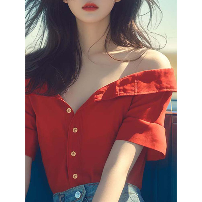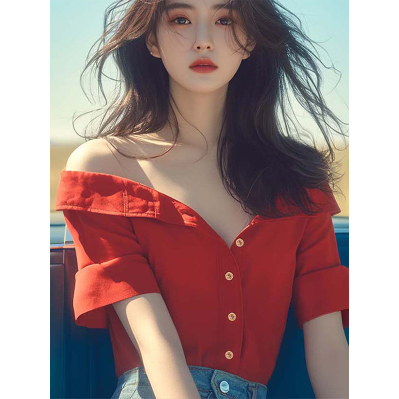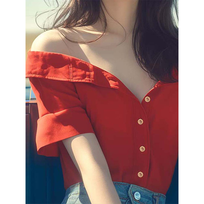 法式轻熟风小众设计感别致独特绝美甜美上衣红色一字漏肩衬衫夏季