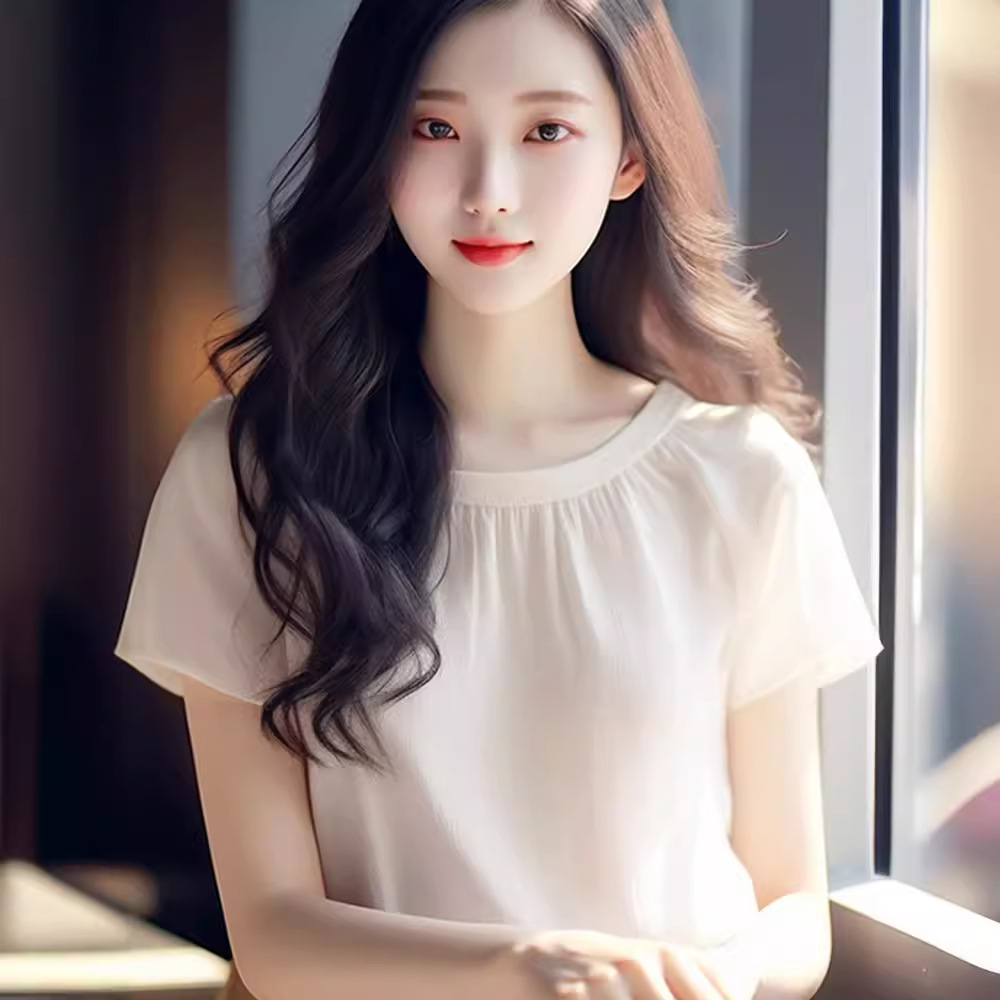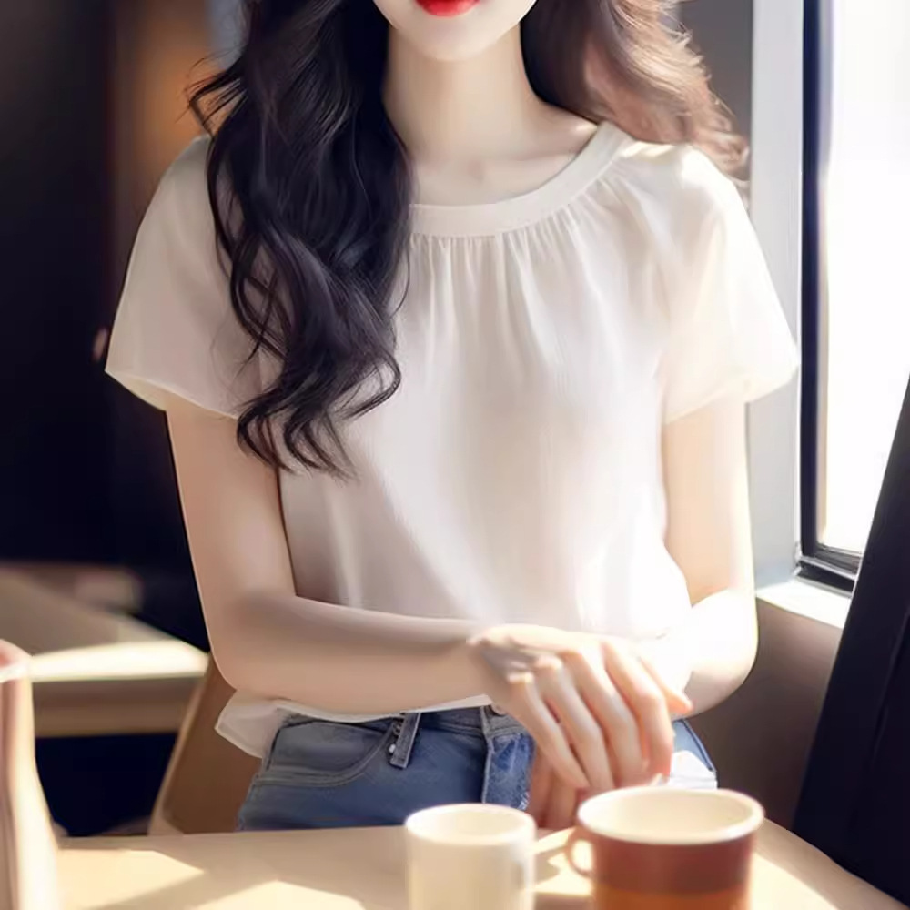 夏季今年流行爆款设计感上衣减龄好看的白色雪纺短袖t恤衫女