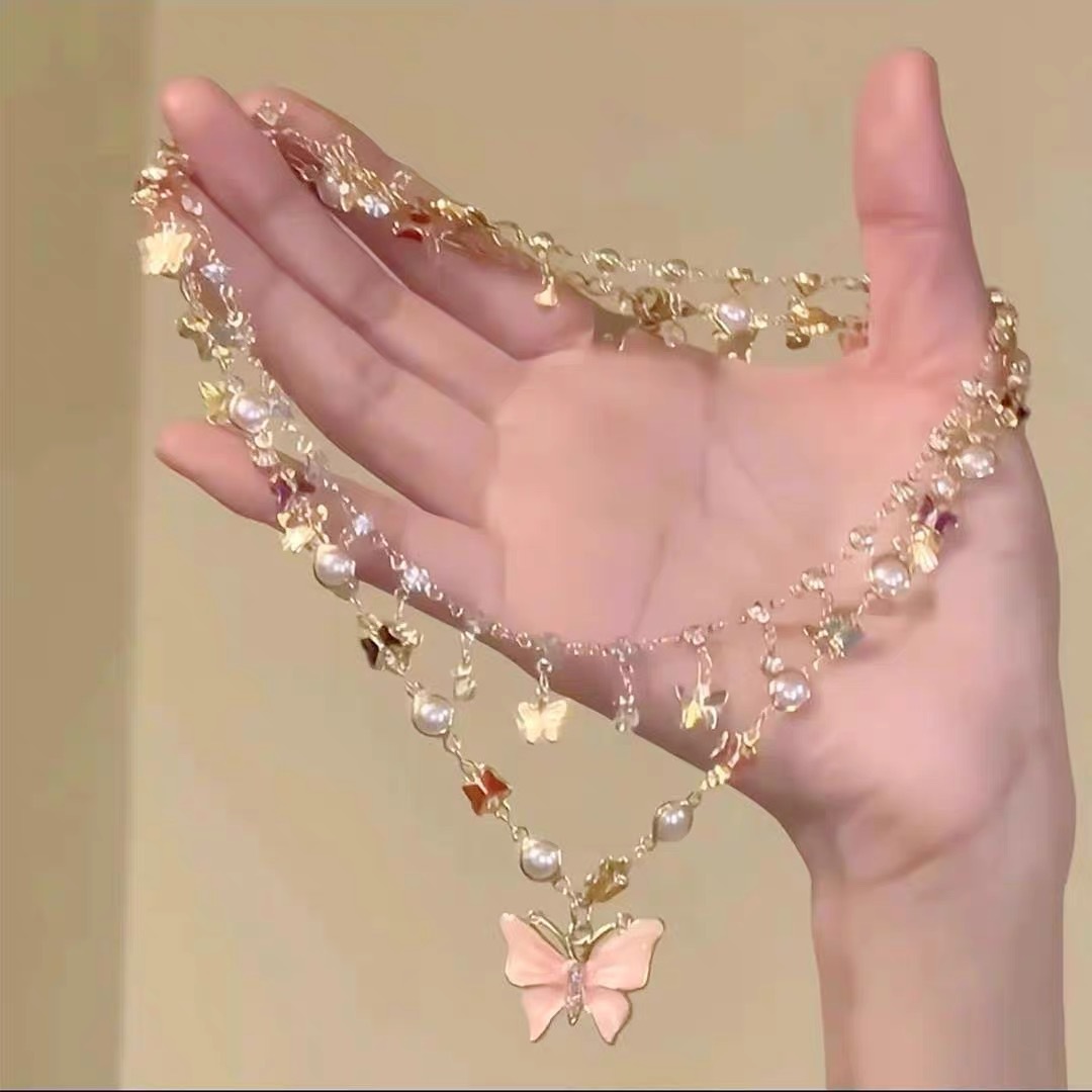 彩色蝴蝶流苏项链叠戴新款流苏锁骨链小众轻奢高级设计感颈链