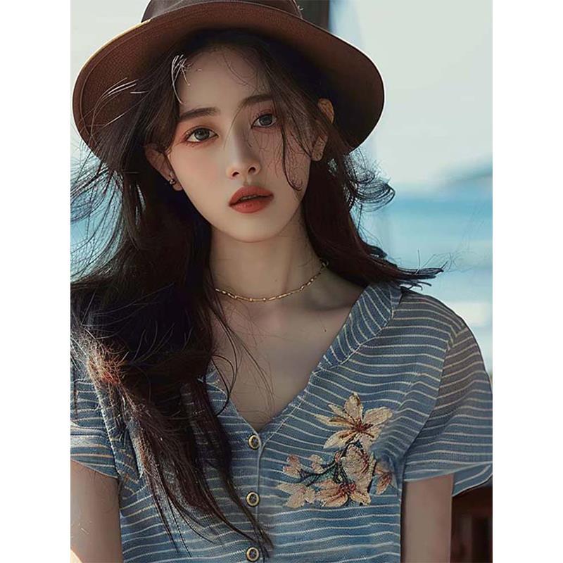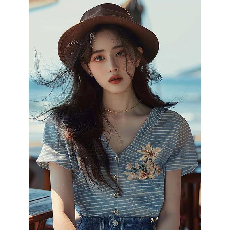 夏季新款小衫法式独特别致上衣法式气质小香风蓝色条纹衬衫女