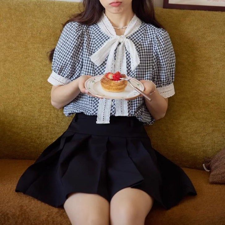 黑色格子衬衫女夏新款法式复古泡泡袖小清新显瘦衬衣