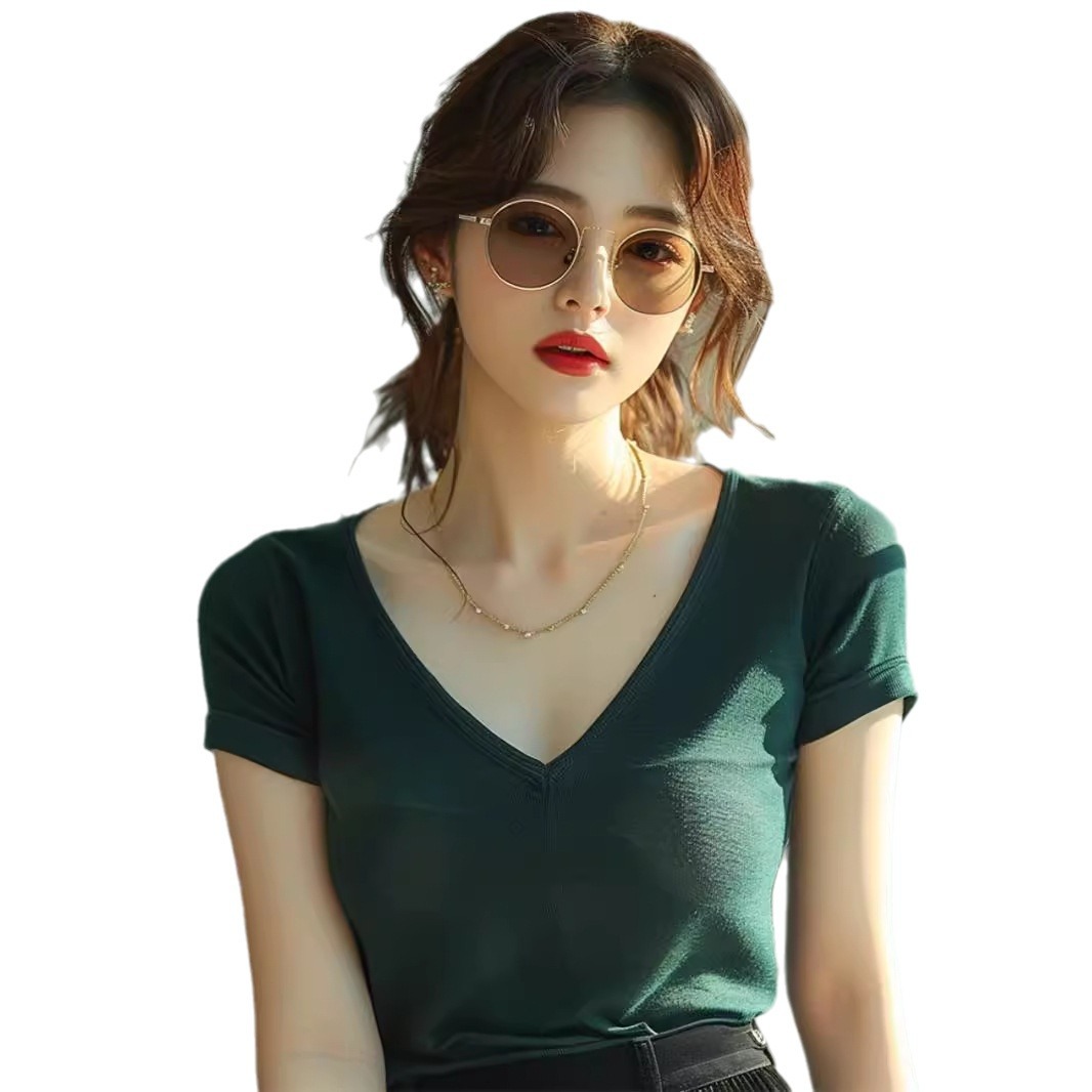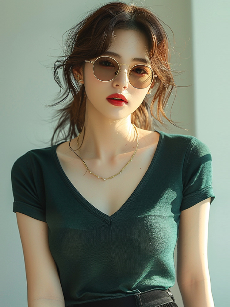 法式复古绿色短袖t恤女夏季新款别致绝美小衫修身显瘦v领上衣