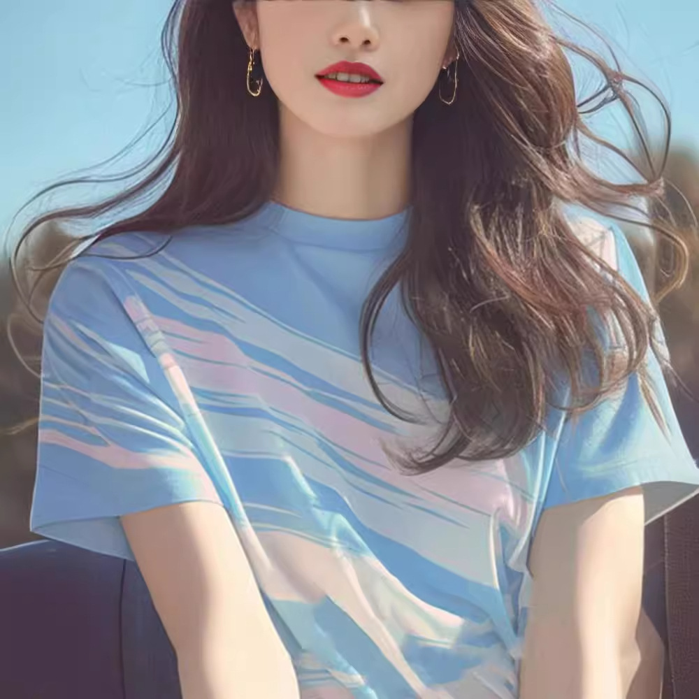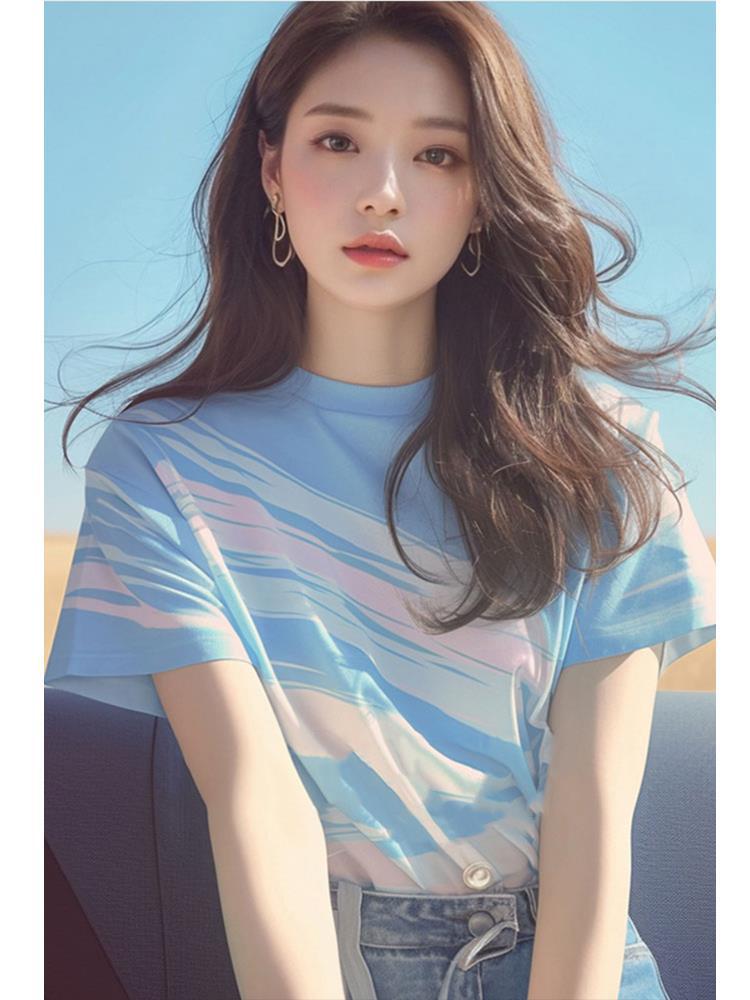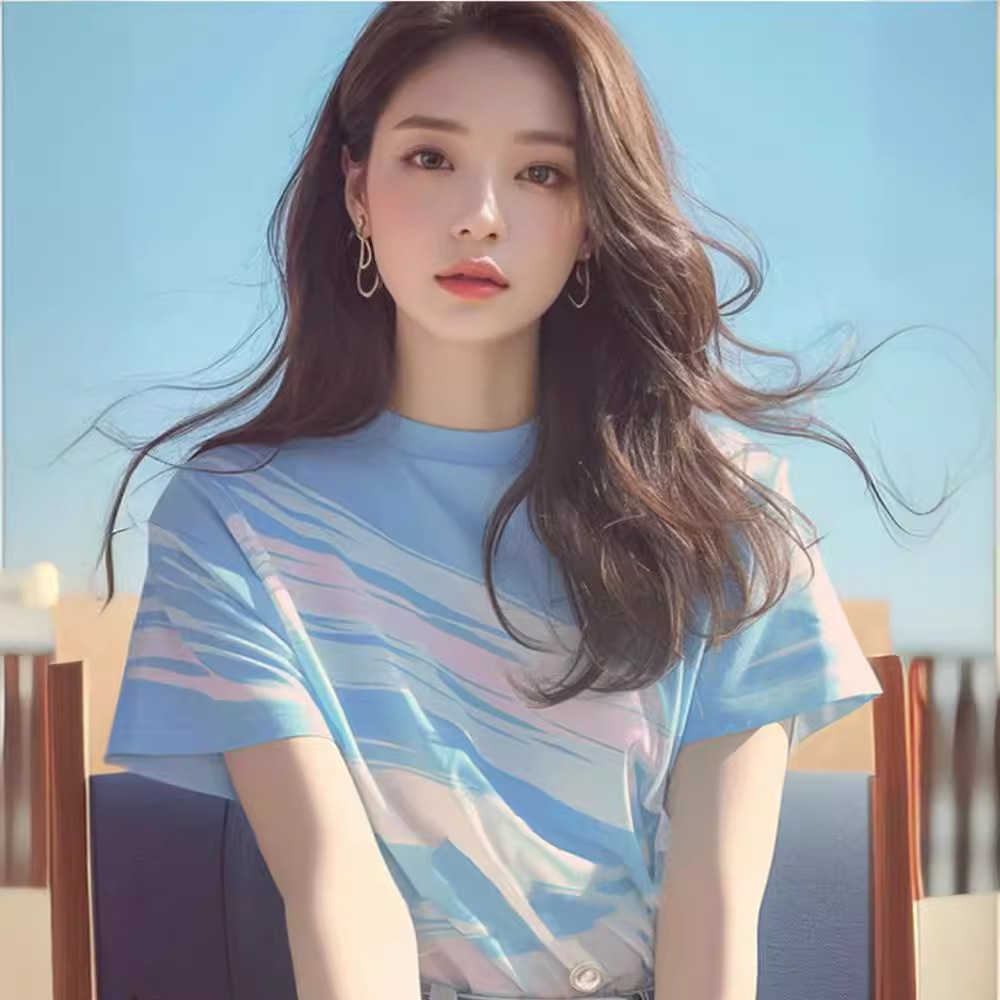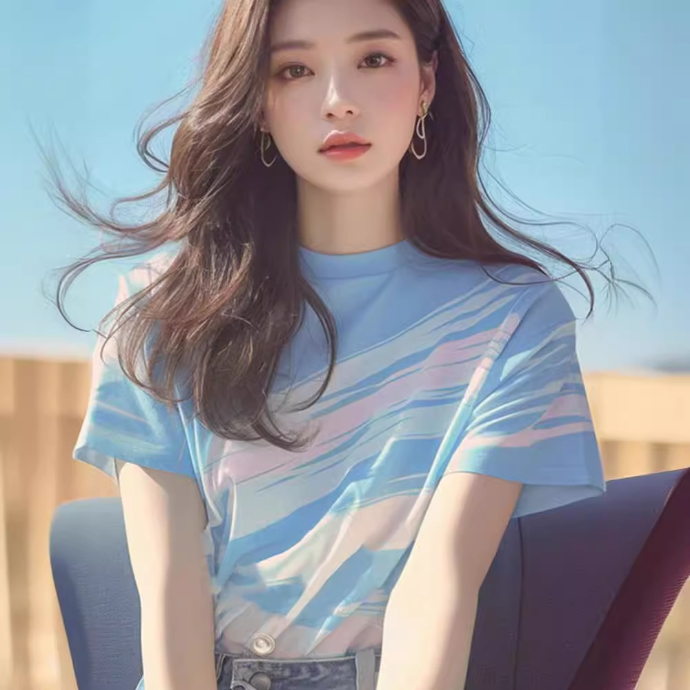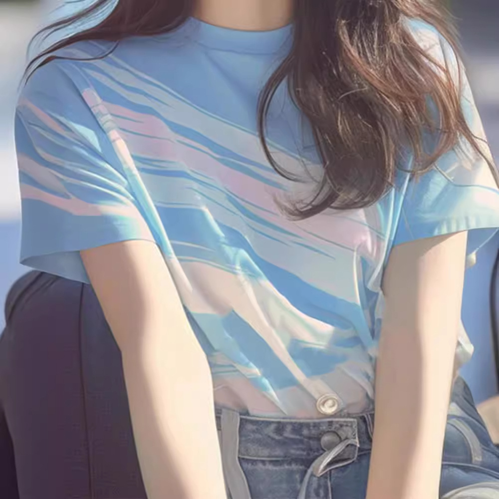 晕染撞色奶蓝色短袖T恤女夏季新款小众设计感法式绝美小上衣