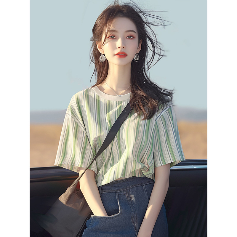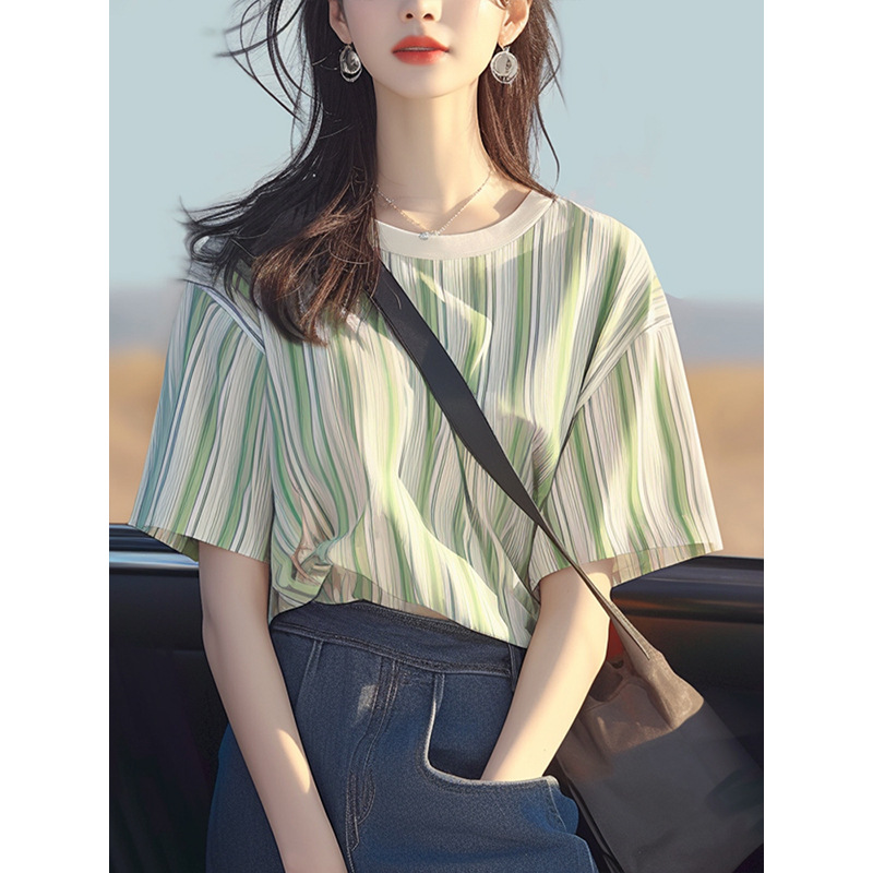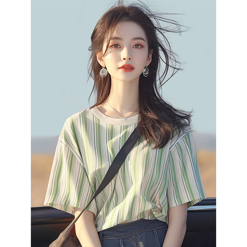 洋气独特超好看上衣别致绝美漂亮薄荷漫波风条纹正肩短袖t恤女夏