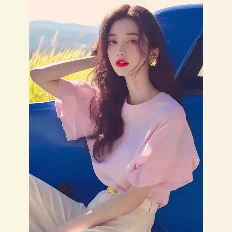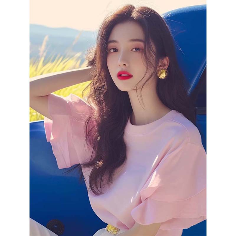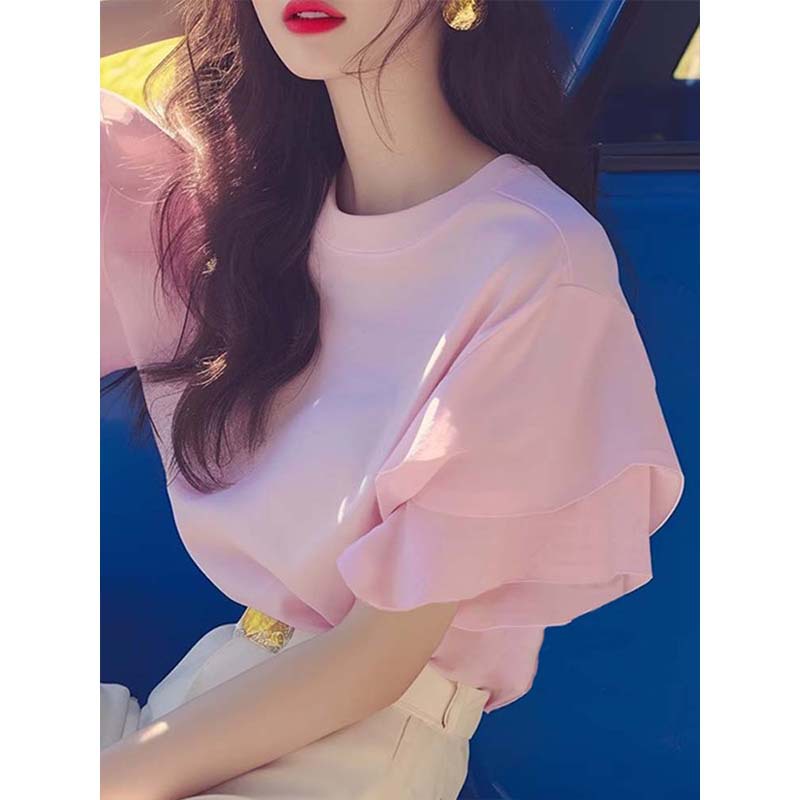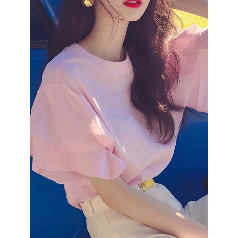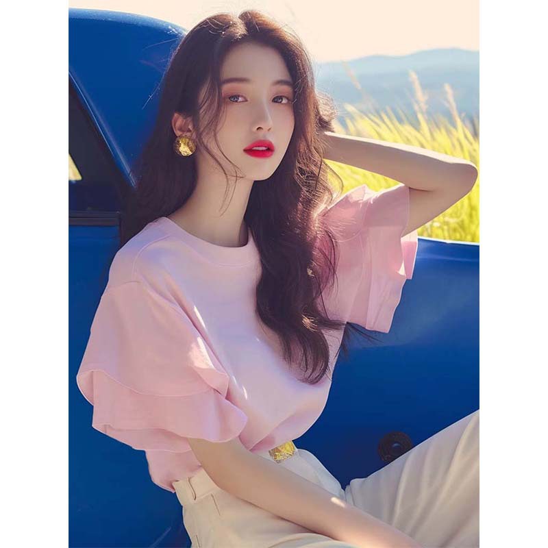 洋气独特超好看别致甜辣很仙的粉色小上衣荷叶边正肩短袖t恤女夏