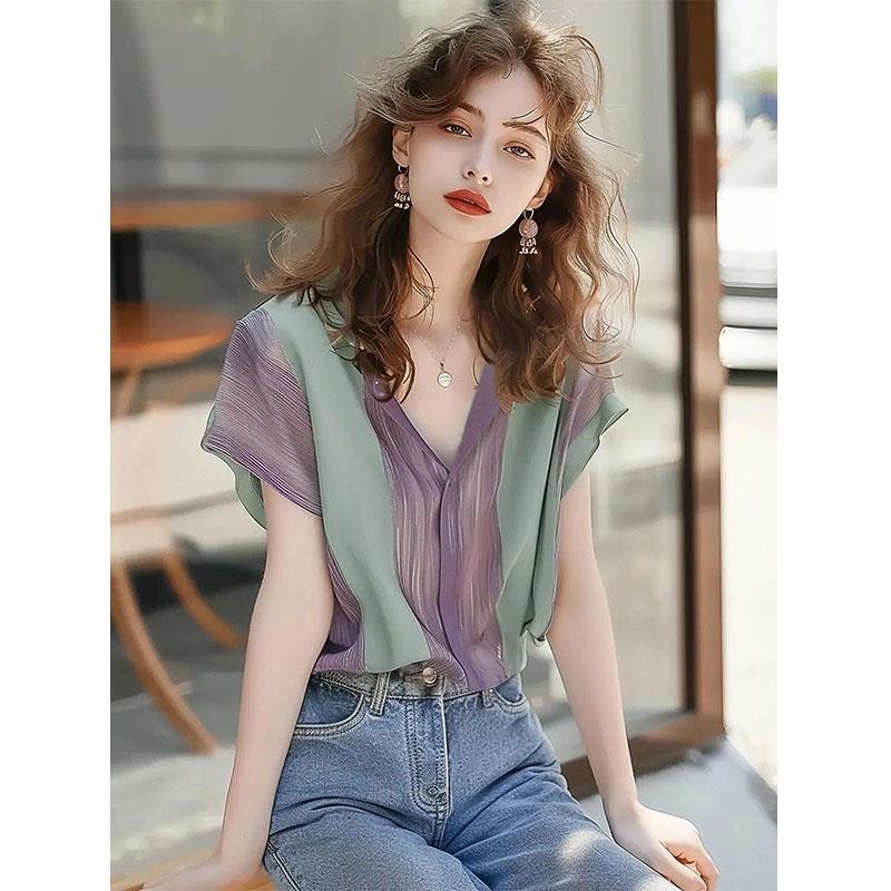 法式v领条纹拼接雪纺短袖衬衫今年流行漂亮别致独特绝美上衣女夏