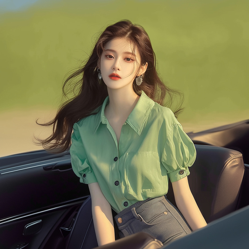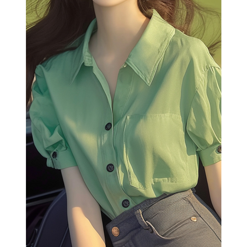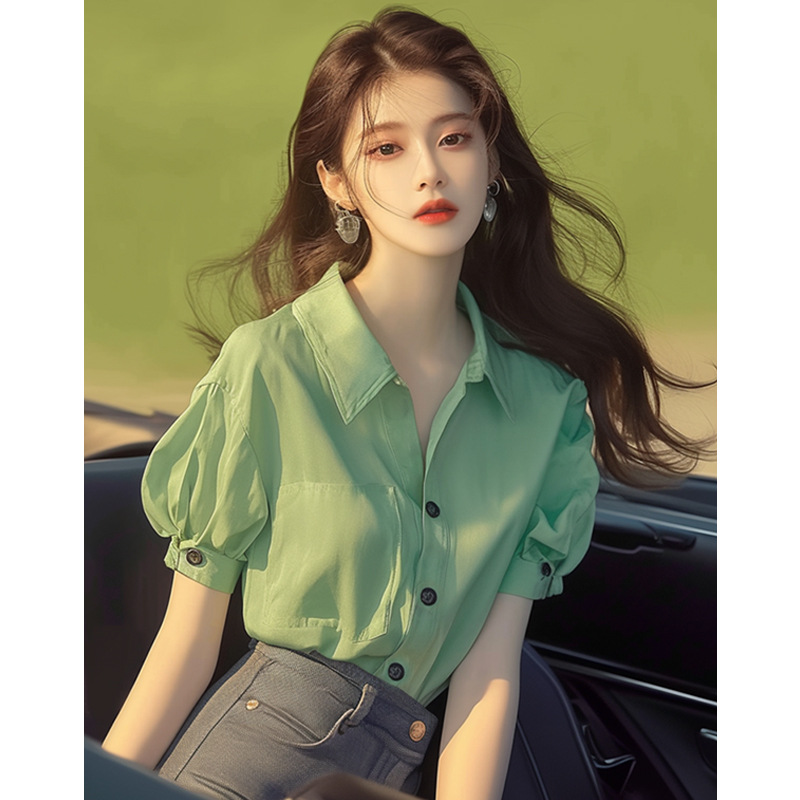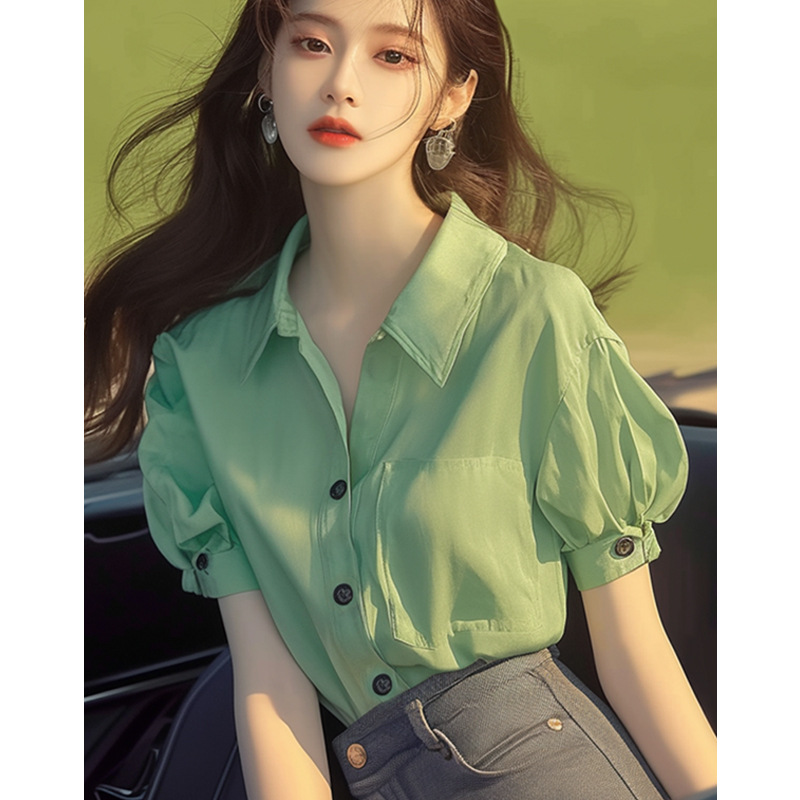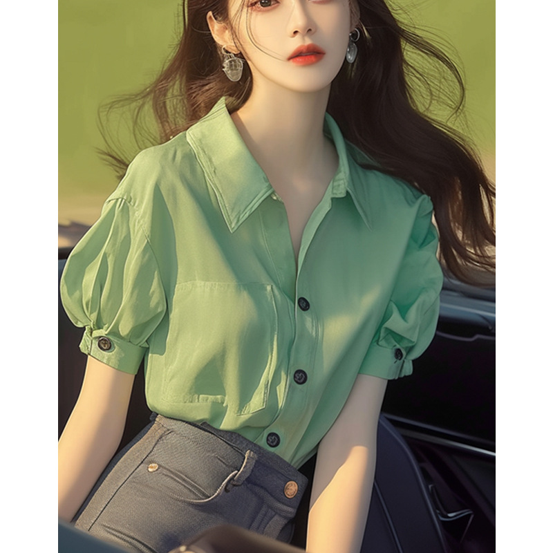 法式轻熟风小众设计感别致独特绝美小衫薄荷曼波风绿色短袖衬衫夏