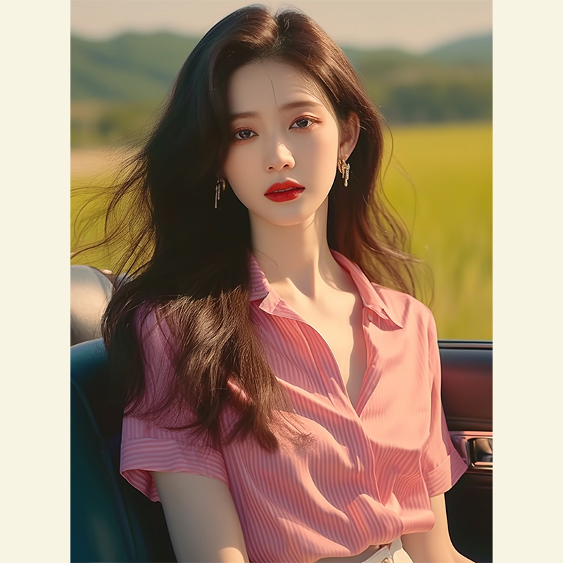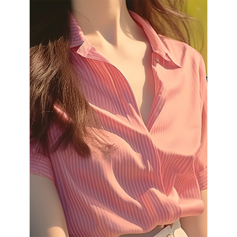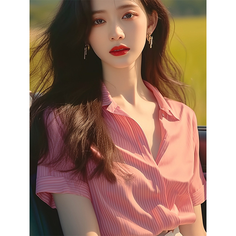 法式高级感粉色条纹短袖衬衫今年流行漂亮小衫别致绝美上衣女夏装