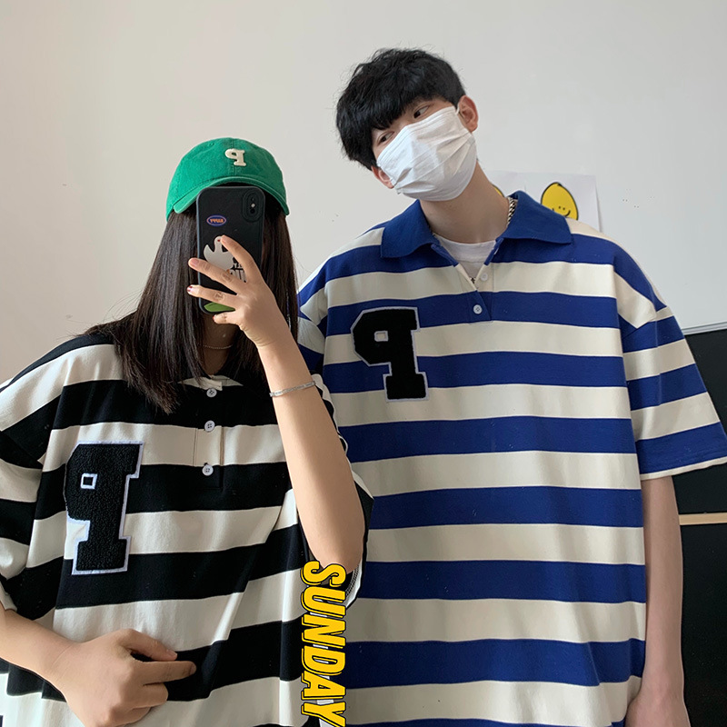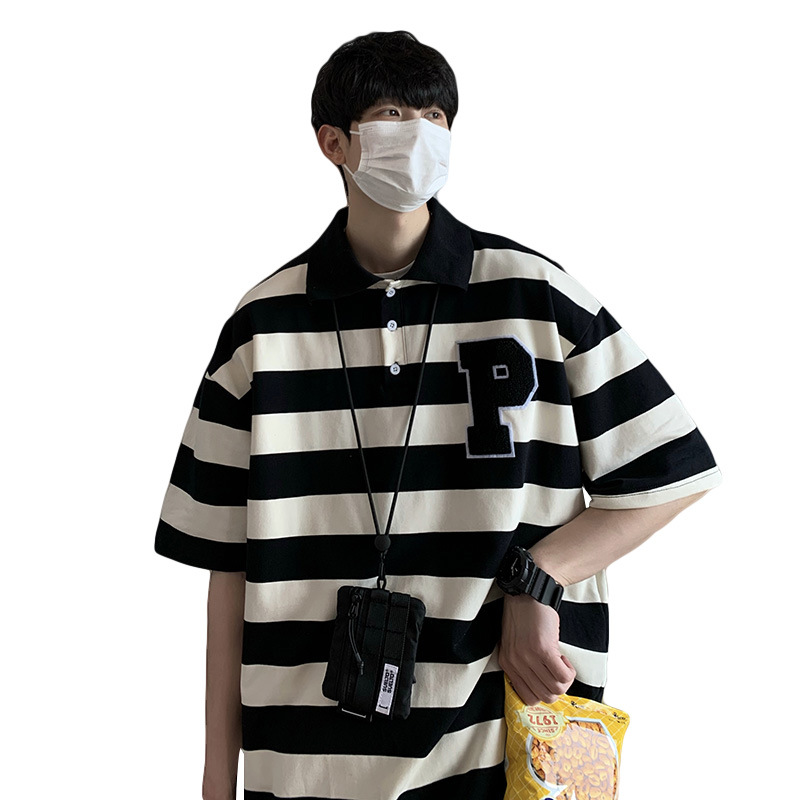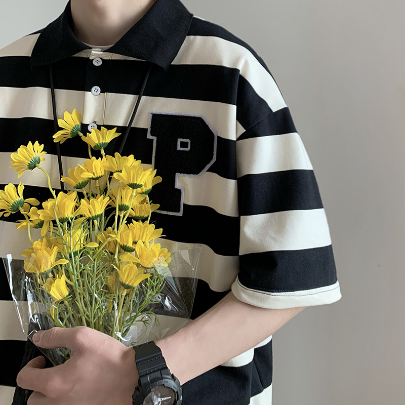 条纹短袖t恤男日系潮流植绒宽松上衣夏季潮牌ins百搭情侣装Polo衫