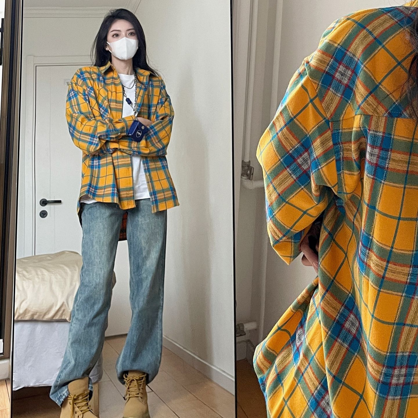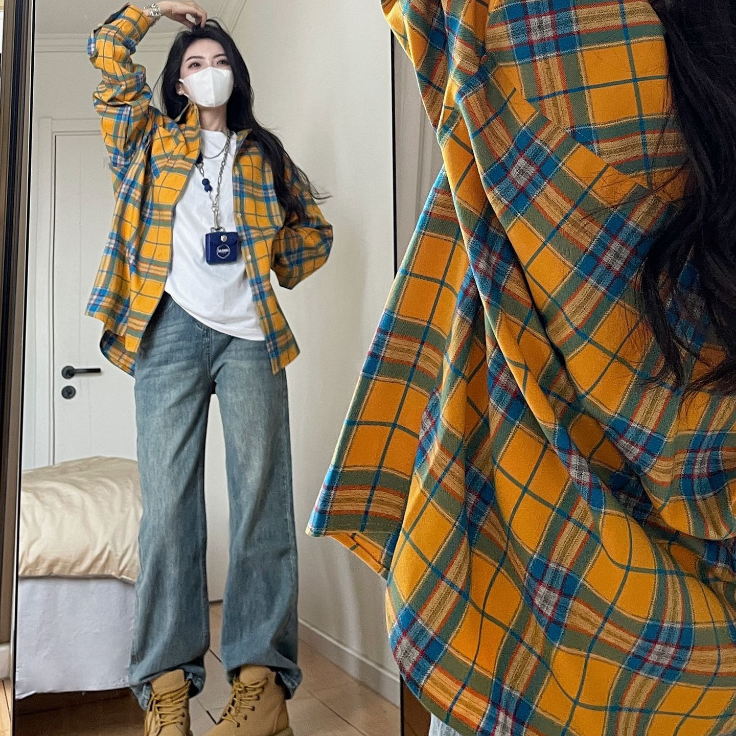 法式黄色格子衬衫衬衣外套女春秋季年新款小个子内搭长袖上衣