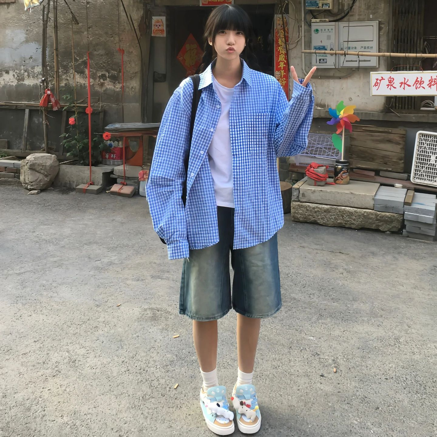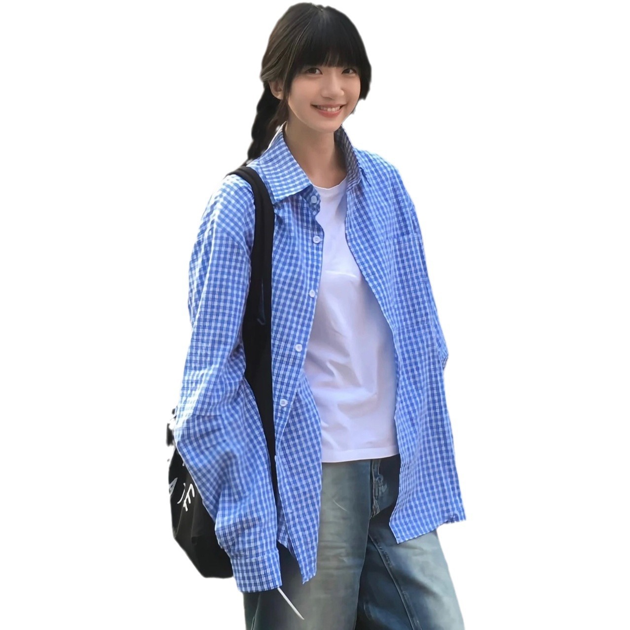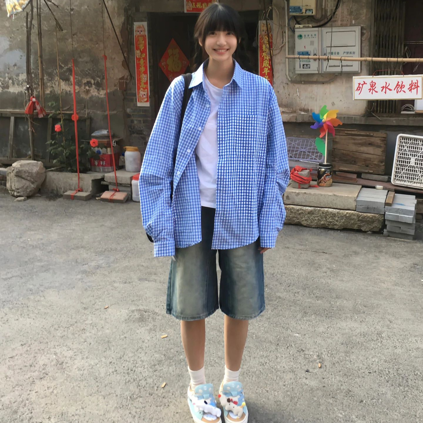 蓝色格子春夏防晒衬衫韩版BF风百搭外套港风复古格纹衬衣