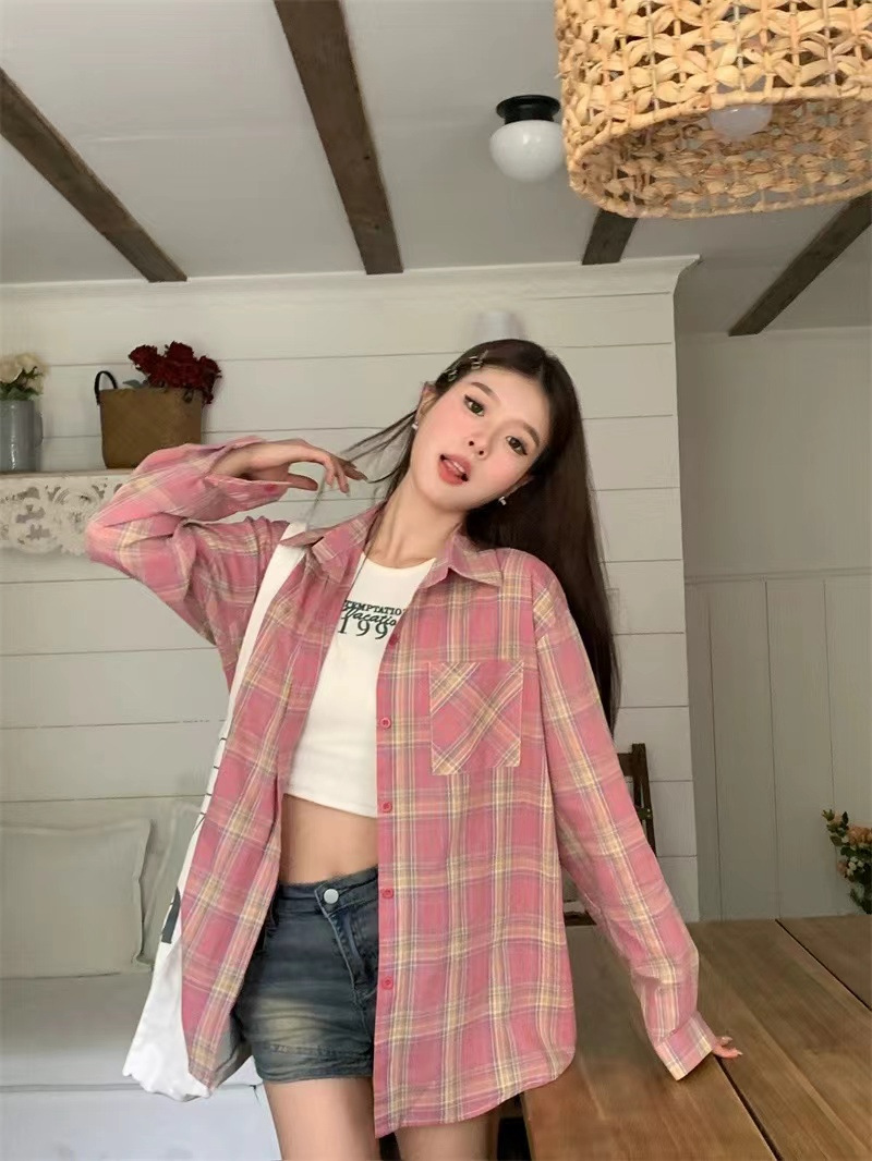 粉色防晒格子衬衫女新春秋夏季港风chic长袖上衣薄款外套