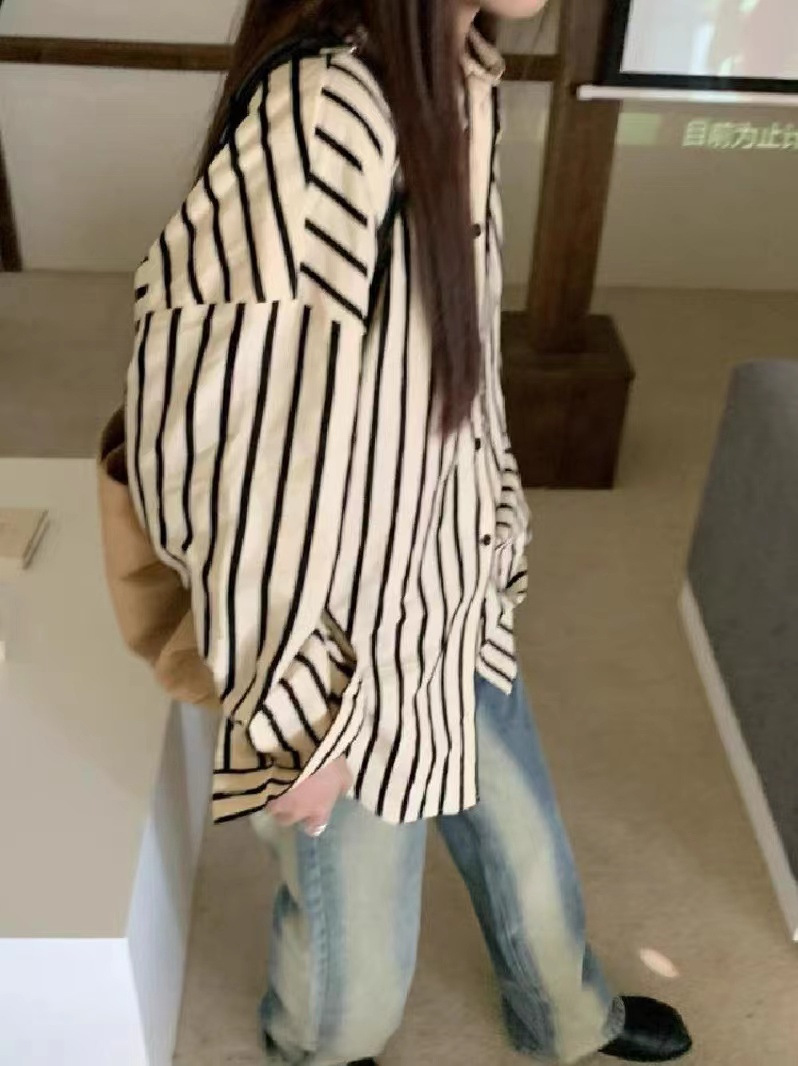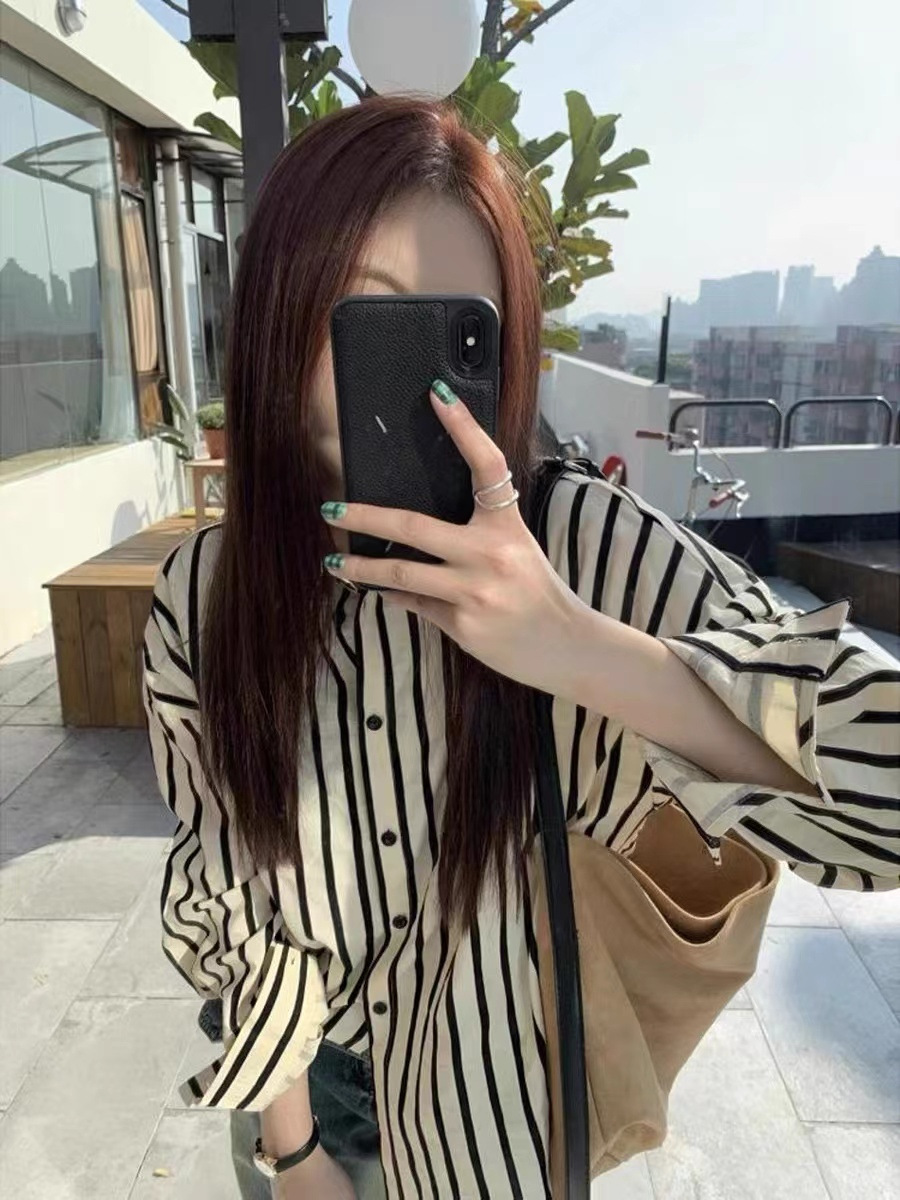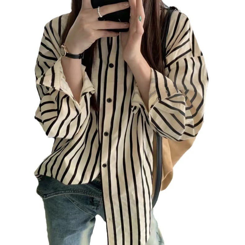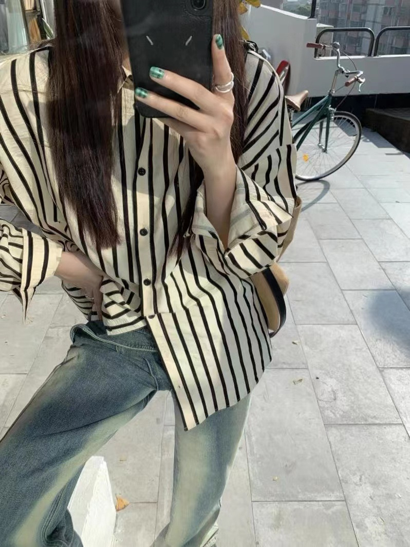 条纹衬衫女设计感小众早春季新款港味复古宽松显瘦中长款长袖上衣