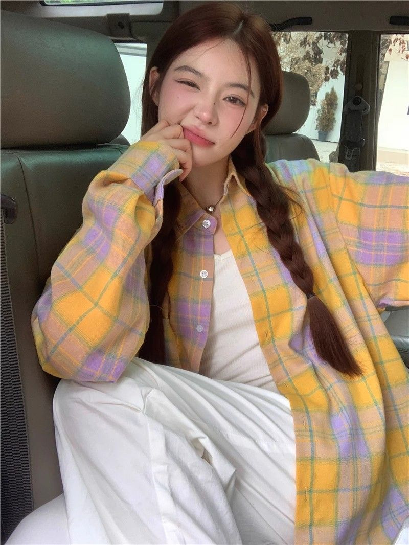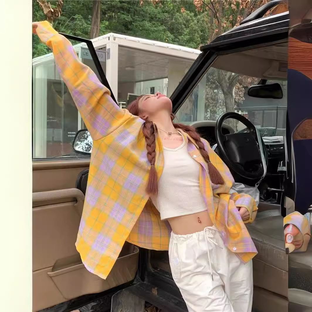 姜黄奶复古长袖格子衬衫女美式休闲宽松中长款衬衣外套