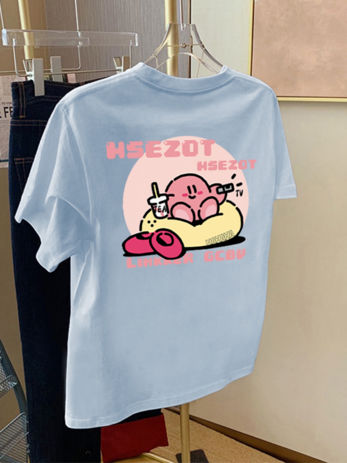 2025夏季新款蓝色纯棉短袖t恤女宽松百搭休闲卡通印花减龄上衣潮