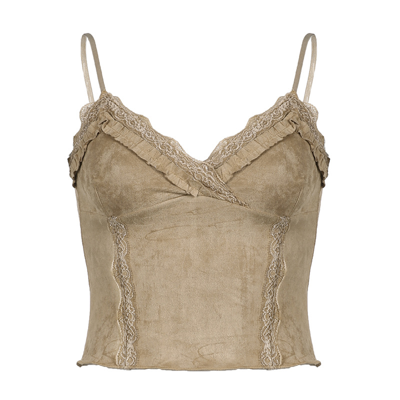 欧美性感辣妹千禧风Y2K背心夏季新款蕾丝荷叶边修身V领小吊带