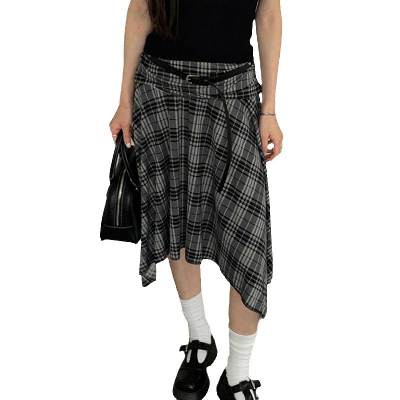 欧美学院风格纹撞色不规则少女半身裙复古低腰百搭显瘦休闲中长裙