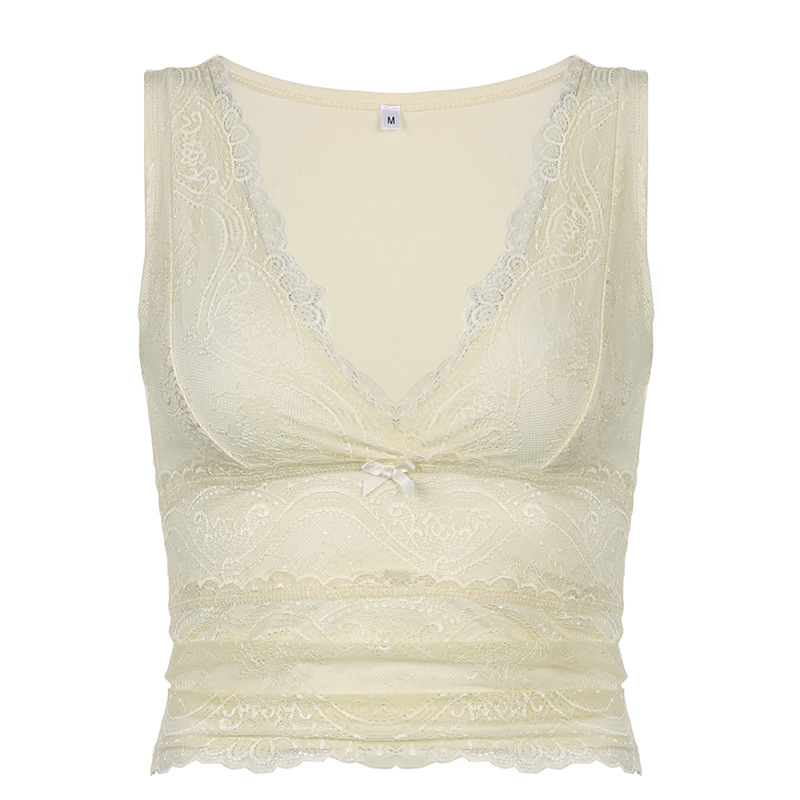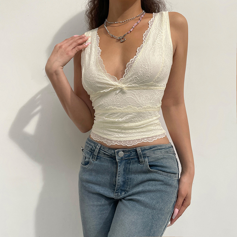 V领双层蕾丝拼接小背心新款欧美辣妹风低胸短款无袖上衣