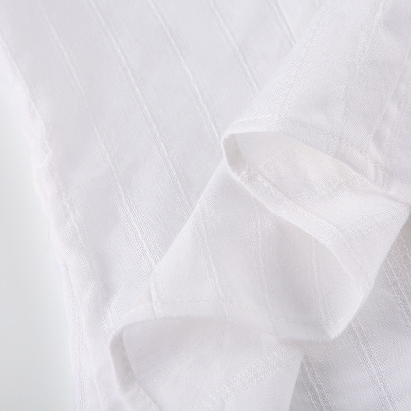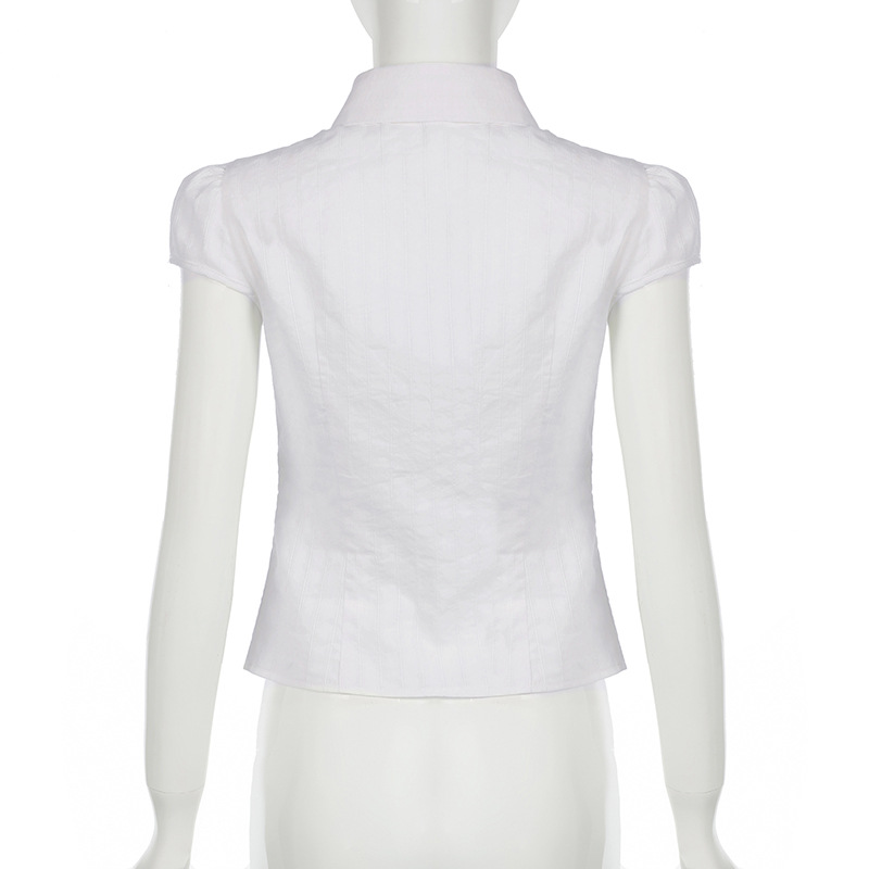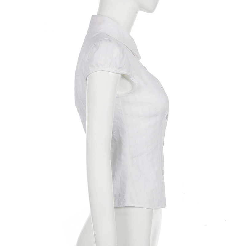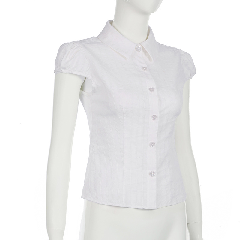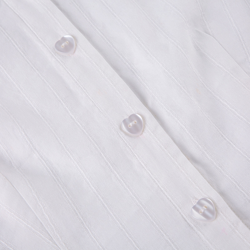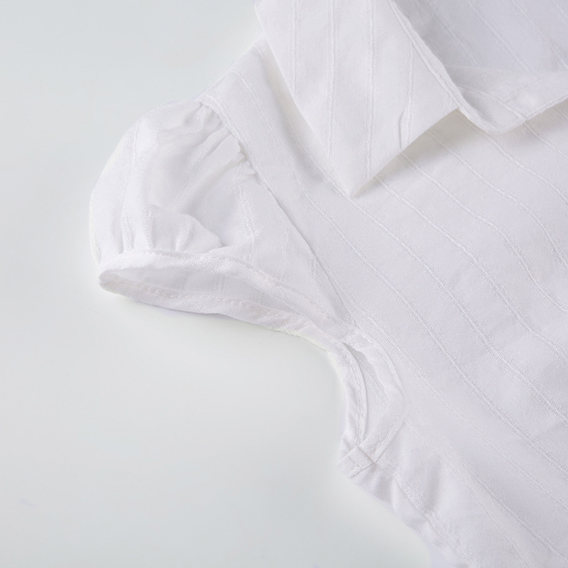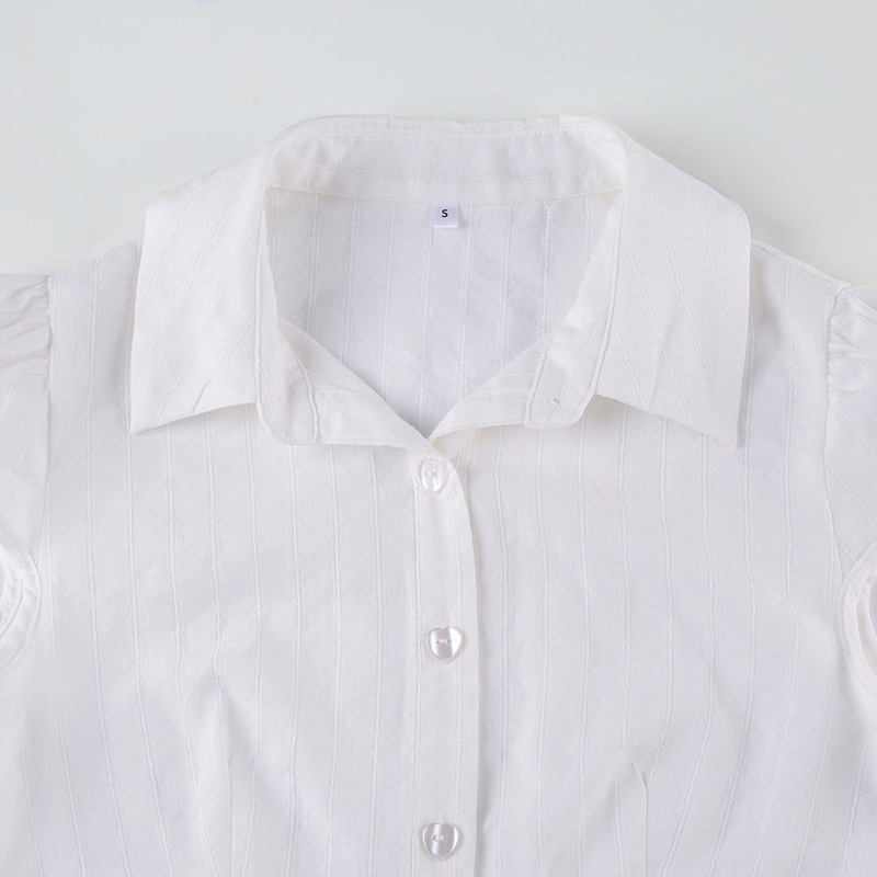 欧美休闲风条纹泡泡袖排扣衬衫女跨境polo领直筒简约宽松基础上衣