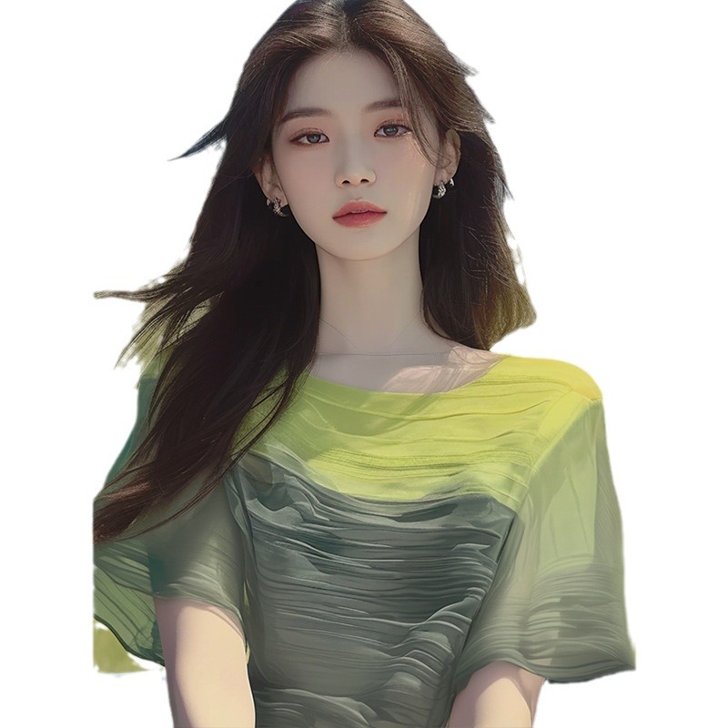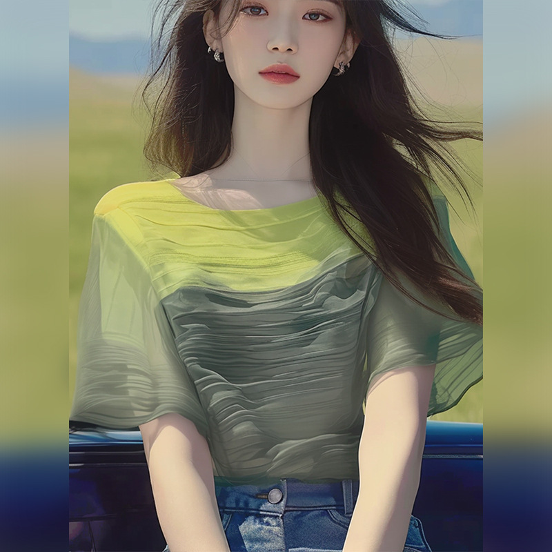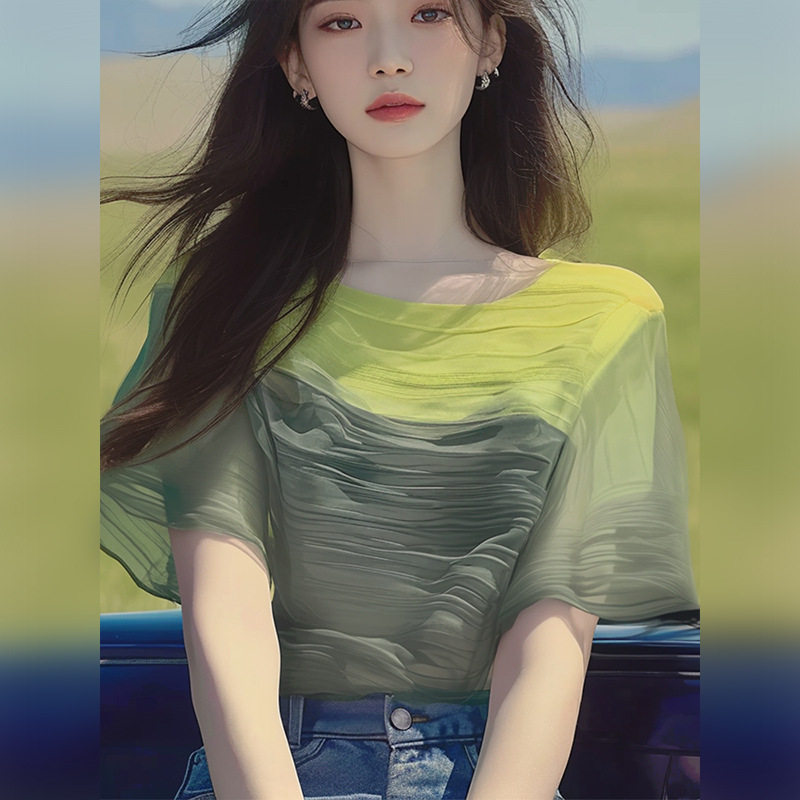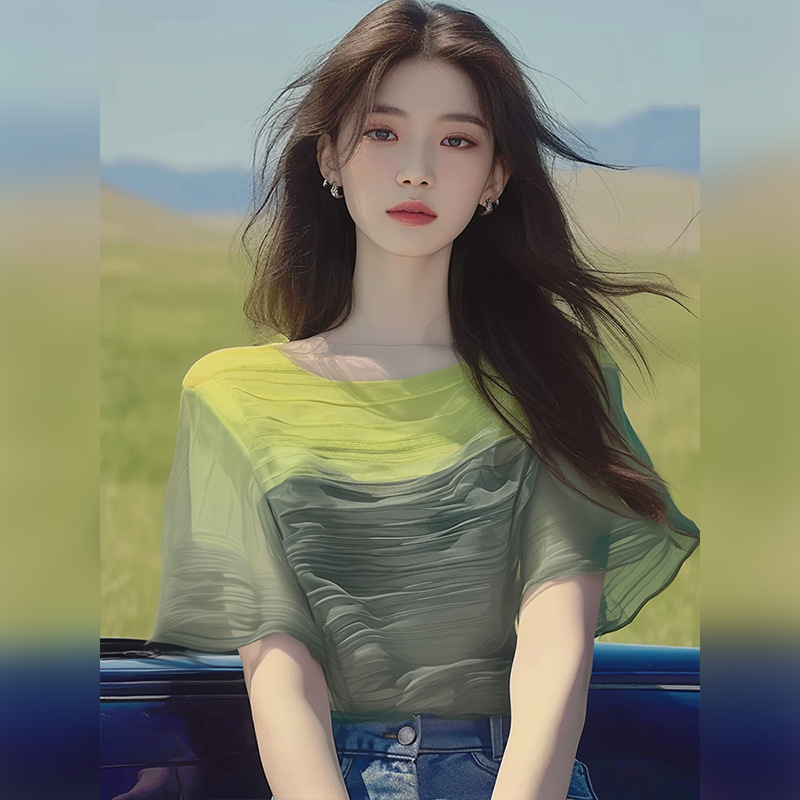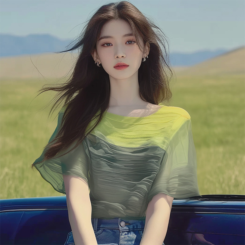 夏季流行小众独特别致上衣洋气炸街减龄遮肉显瘦绿色撞色雪纺T恤