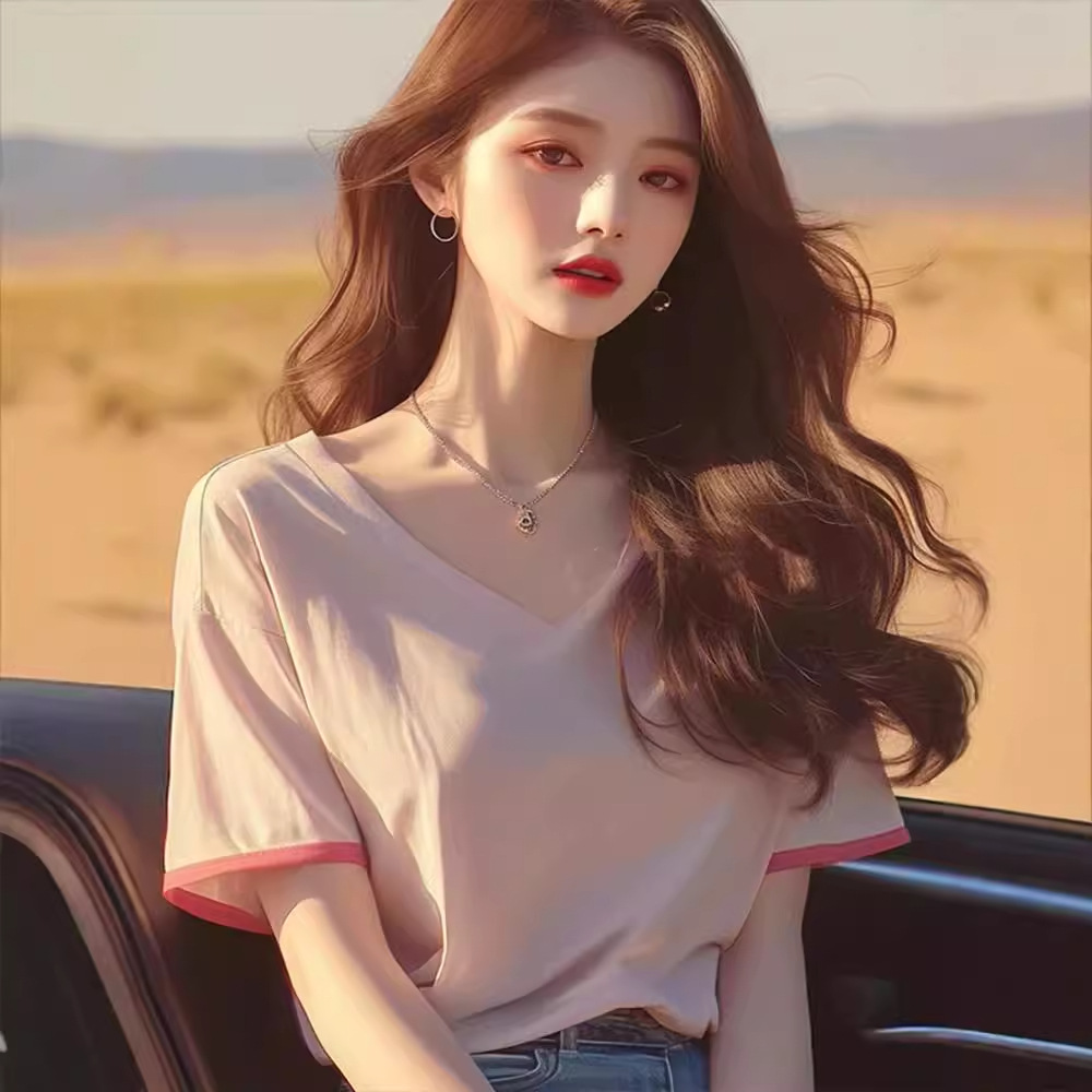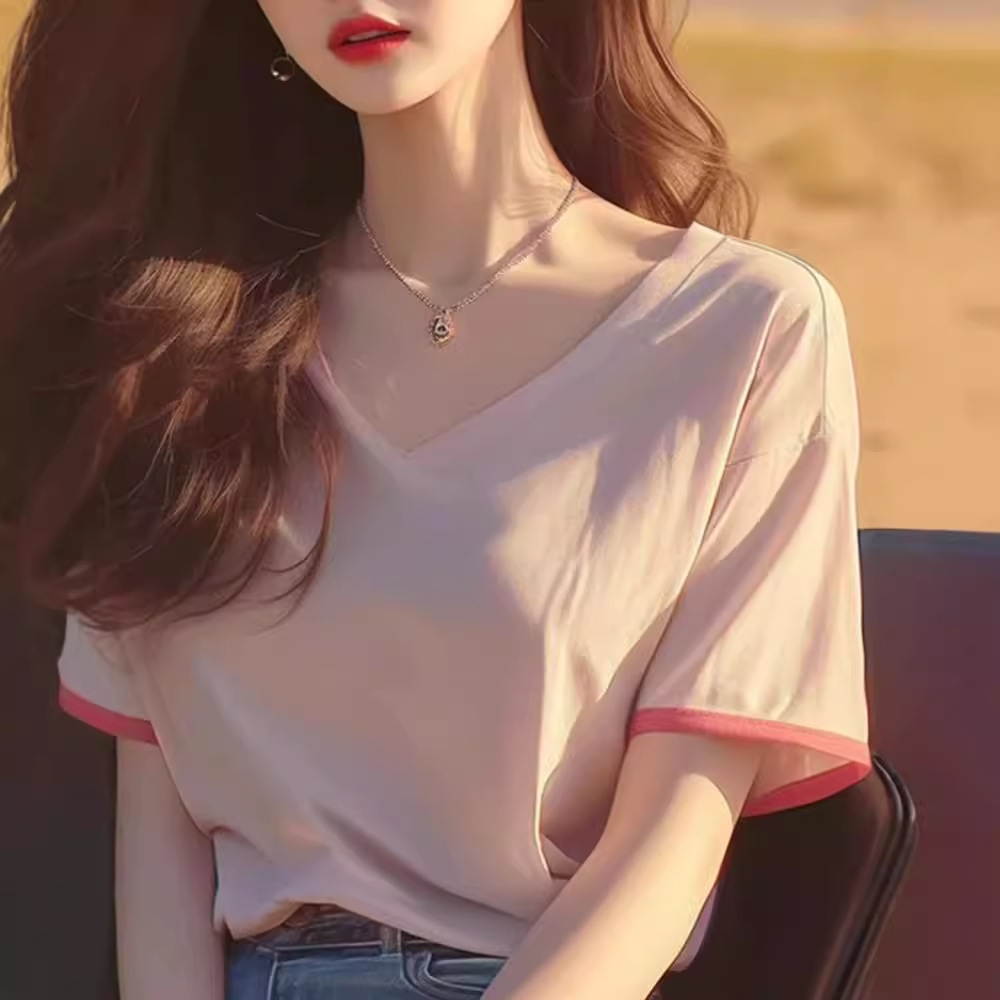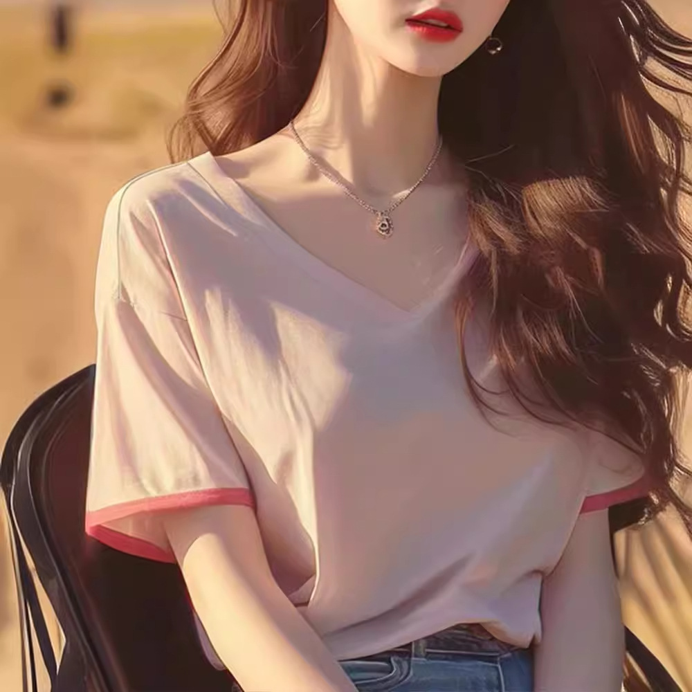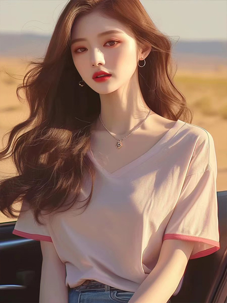 甜辣V领短袖t恤女新款爆款夏季减龄洋气独特别致宽松半袖上衣