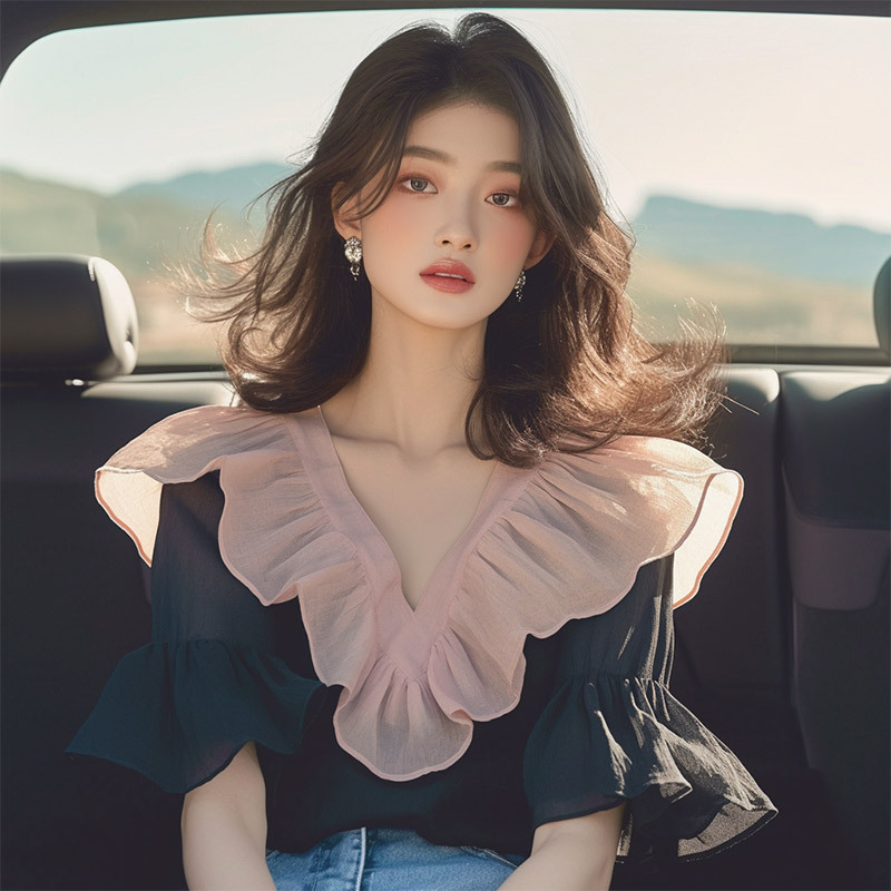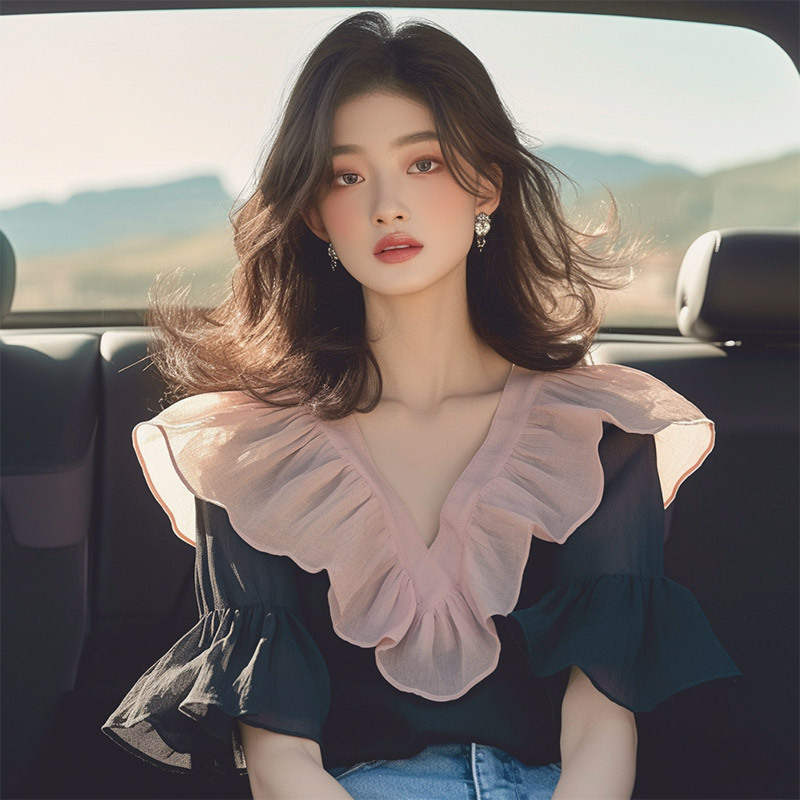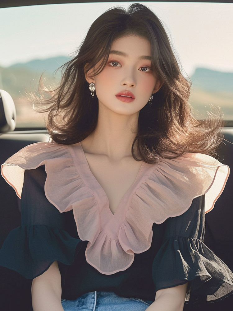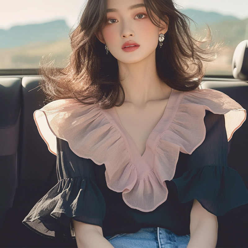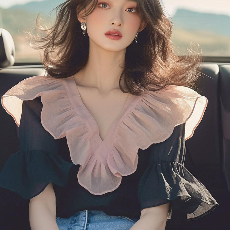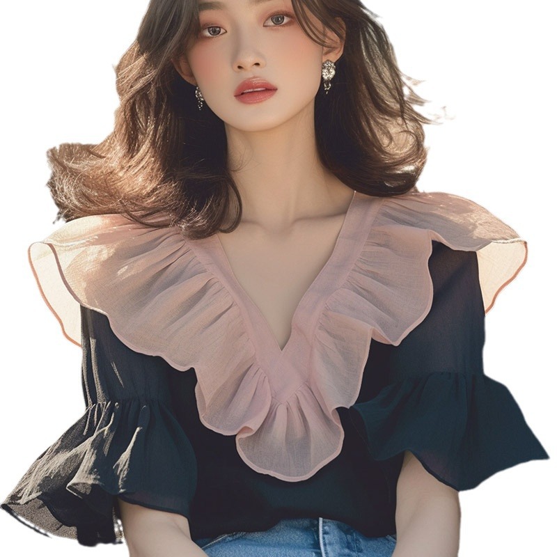 小众洋气设计感上衣法式轻熟高端气质绝美黑色荷叶边拼接衬衫女夏